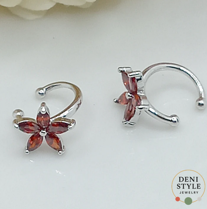 Elegáns, virágformájú fülgyűrű páros vörös kristályokkal.
