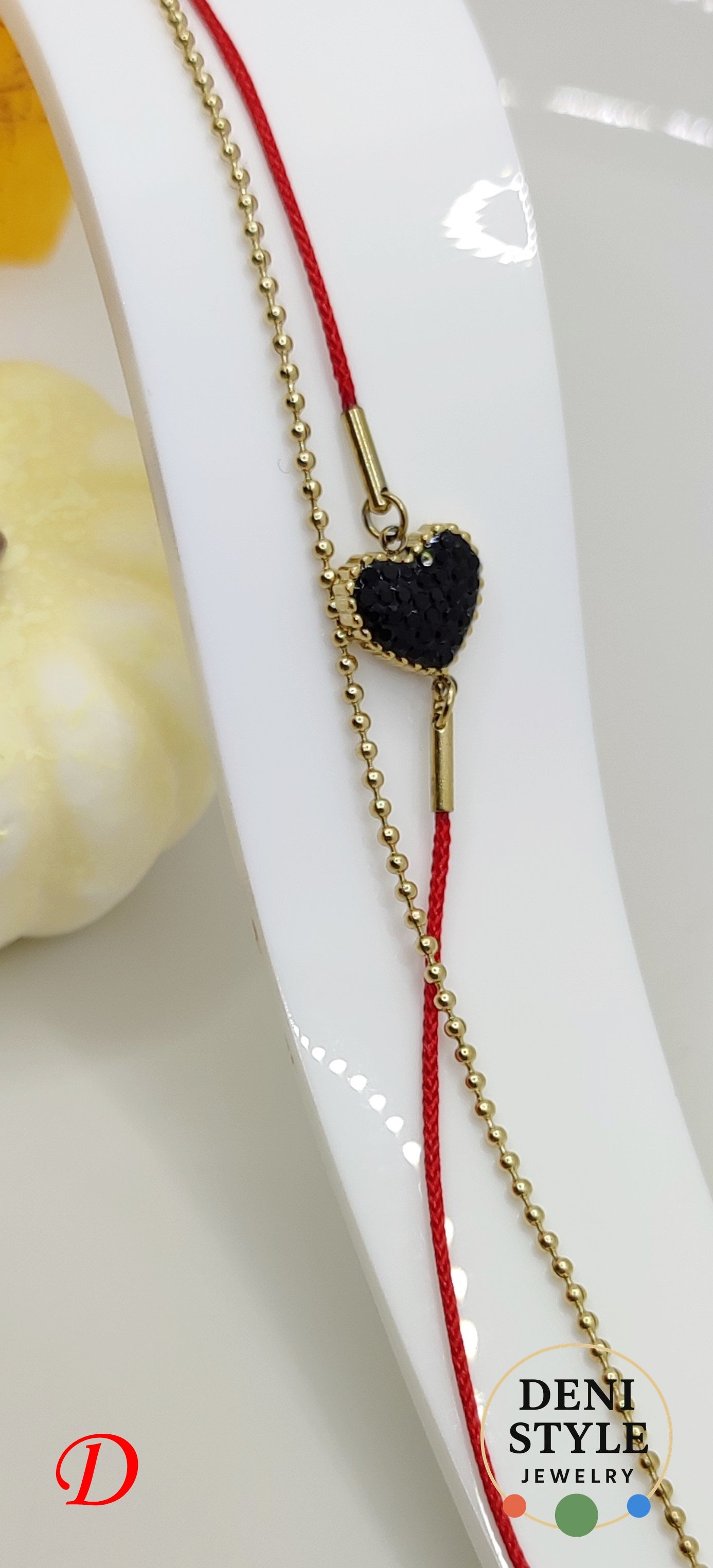 Ez az arany színű, fekete szívecskés karkötő piros zsinórral igazán trendi és különleges választás! ✨