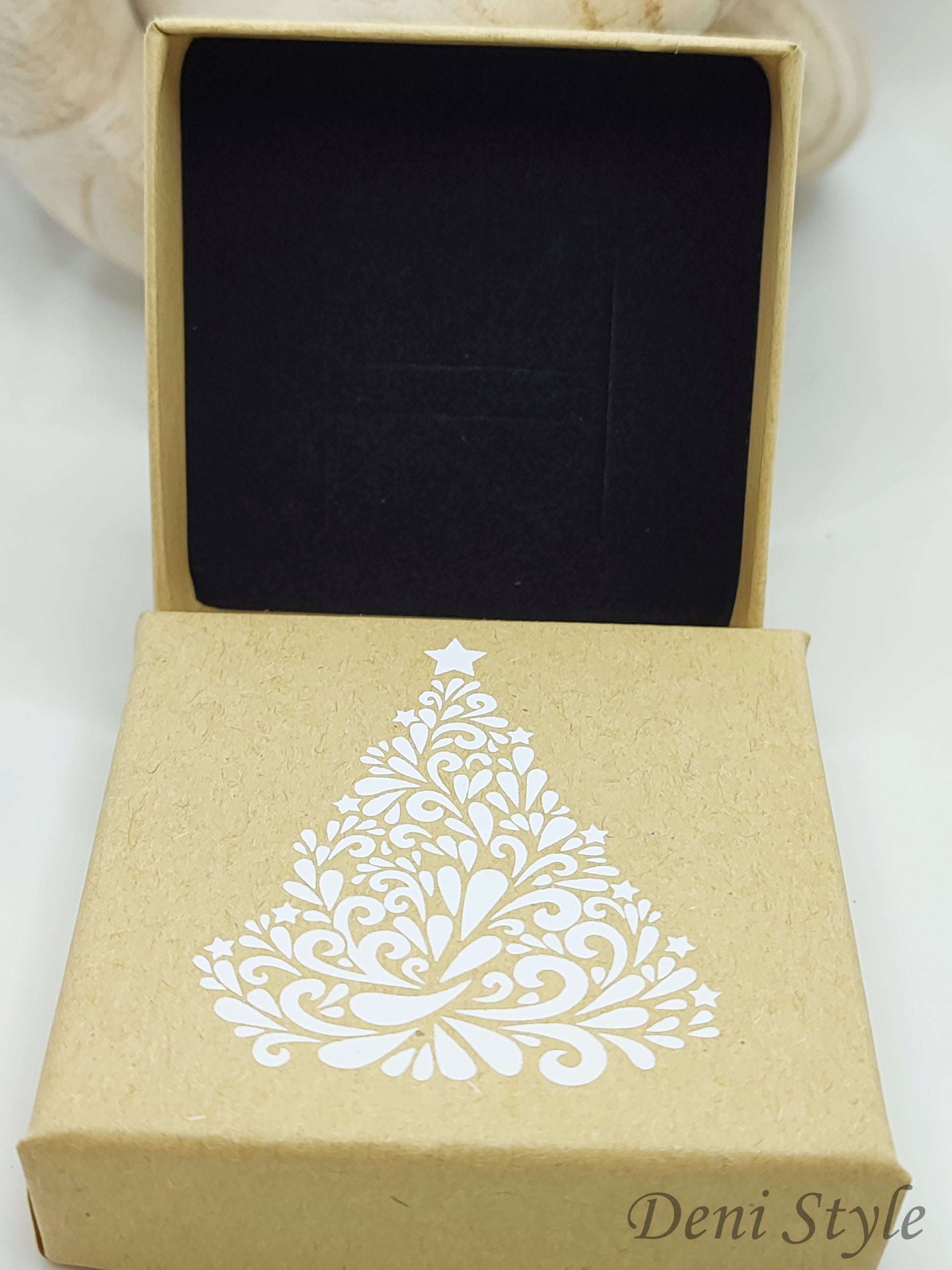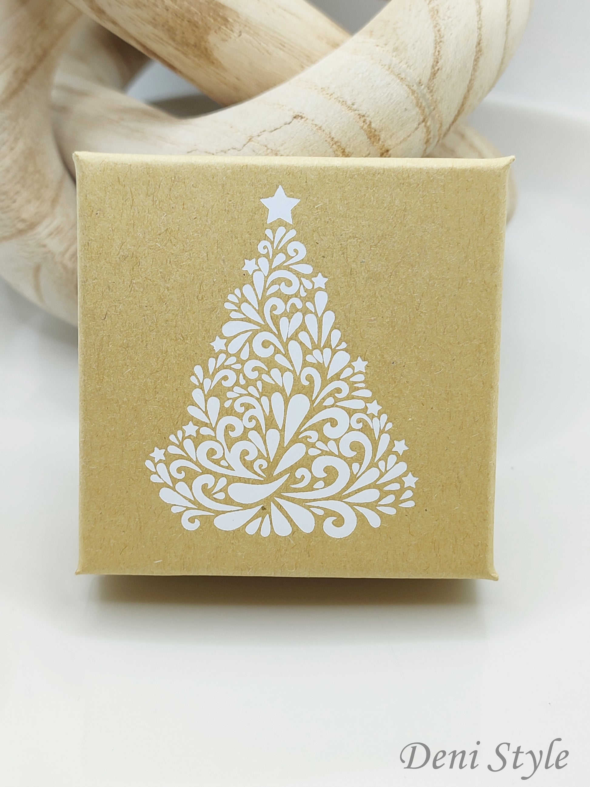 Természetes hatású, natúr karton ékszerdoboz hófehér karácsonyfás díszítéssel.