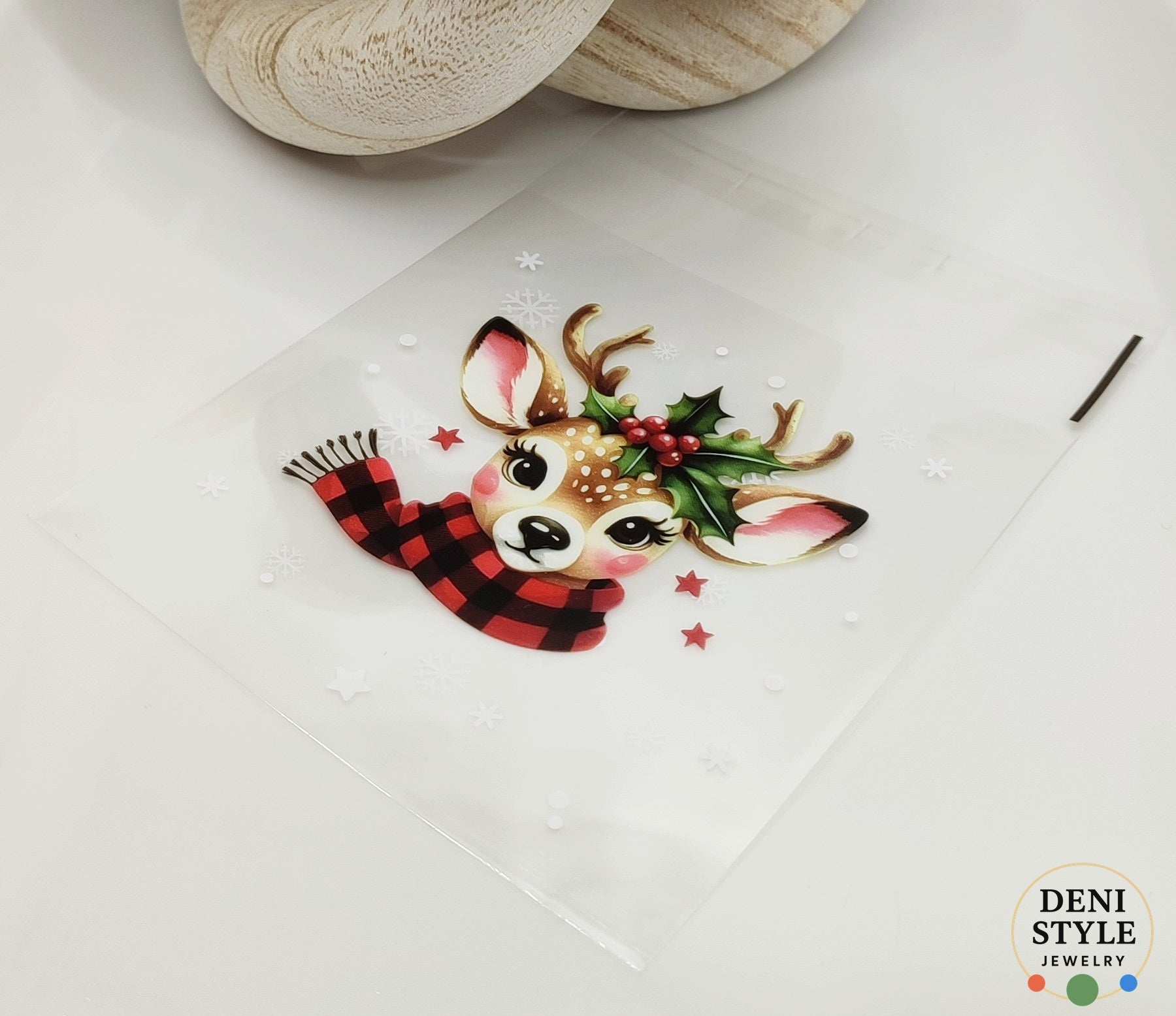 Elegáns és bájos karácsonyi ajándéktasak aranyos szarvas mintával, piros-fekete sállal és ünnepi díszítéssel. Tökéletes ékszerek, vagy apró ajándékok csomagolásához. Az öntapadós záródás egyszerűvé teszi a használatot, miközben látványos, ünnepi megjelenést biztosít.