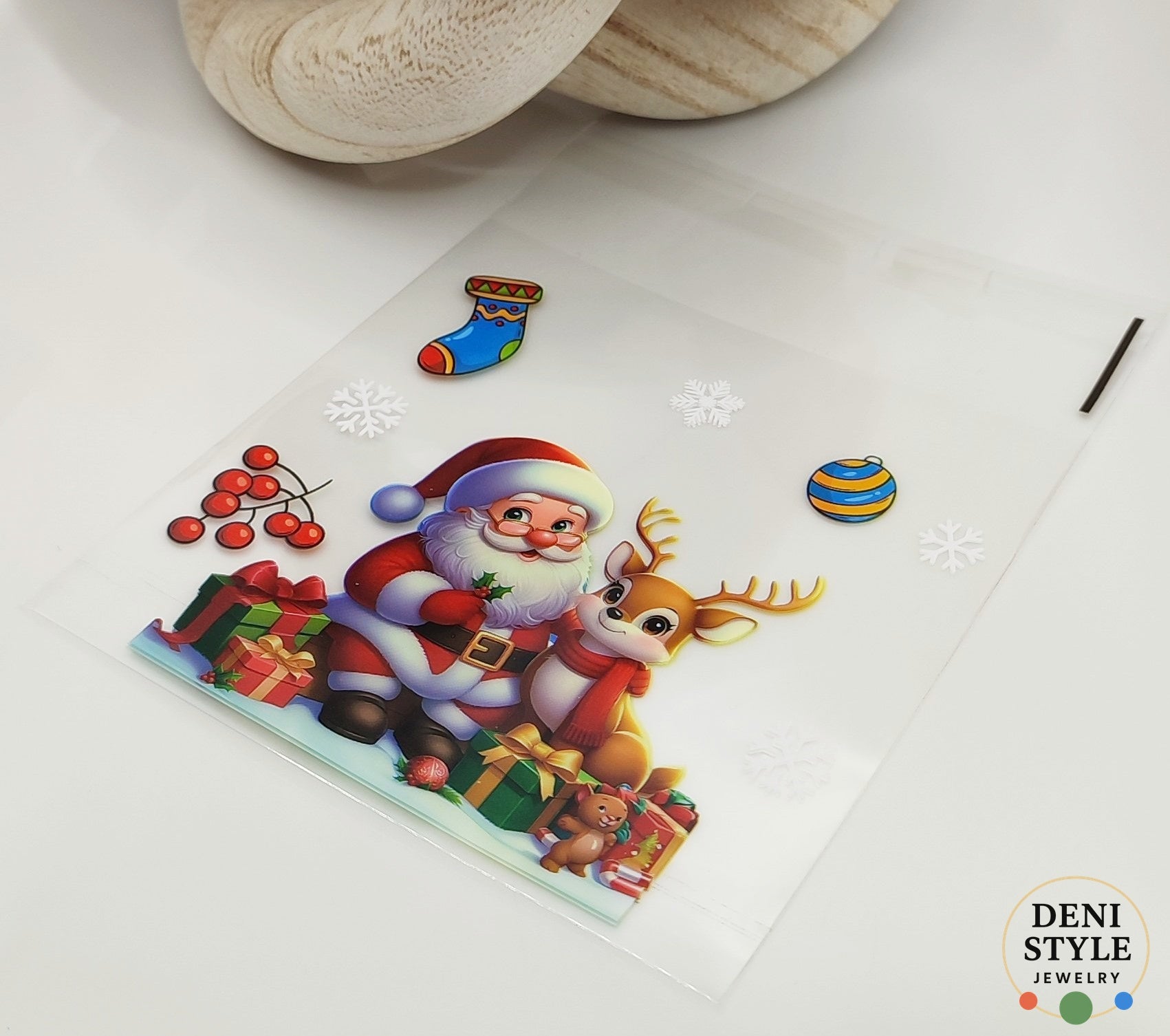 Karácsonyi ajándéktasak kedves Mikulás és rénszarvas mintával, ajándékdobozokkal és ünnepi részletekkel díszítve. Ideális ékszerek vagy kisebb meglepetések csomagolásához. Az öntapadós záródás praktikus és biztos megoldást kínál, miközben látványos, ünnepi megjelenést ad.