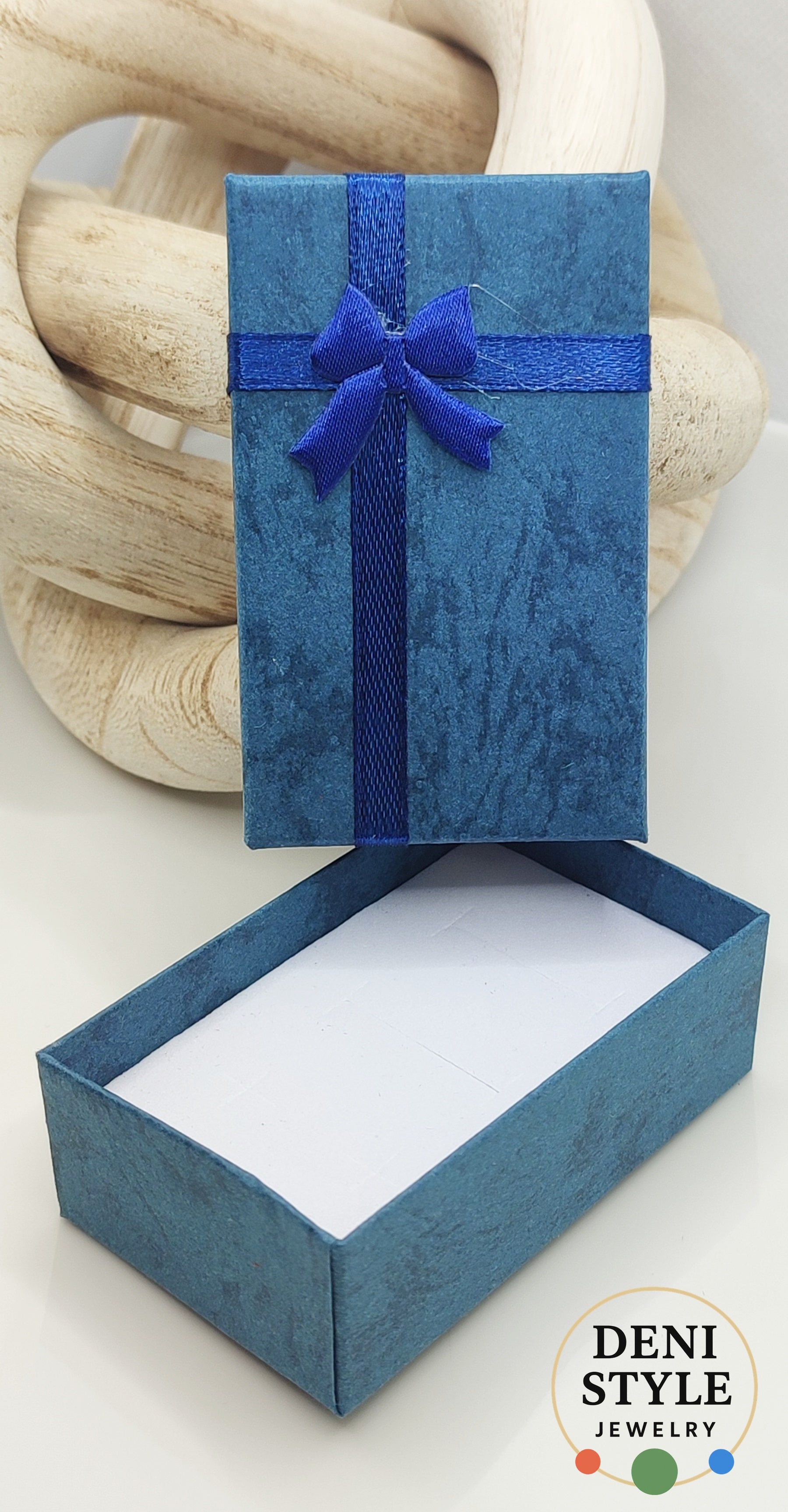 Elegáns, sötétkék ékszerdoboz masnis díszítéssel, amely tökéletes választás ajándékba szánt ékszerek csomagolásához. Kellemes árnyalata kifinomult megjelenést kölcsönöz, a puha belső rész pedig óvja az ékszereket a sérüléstől.