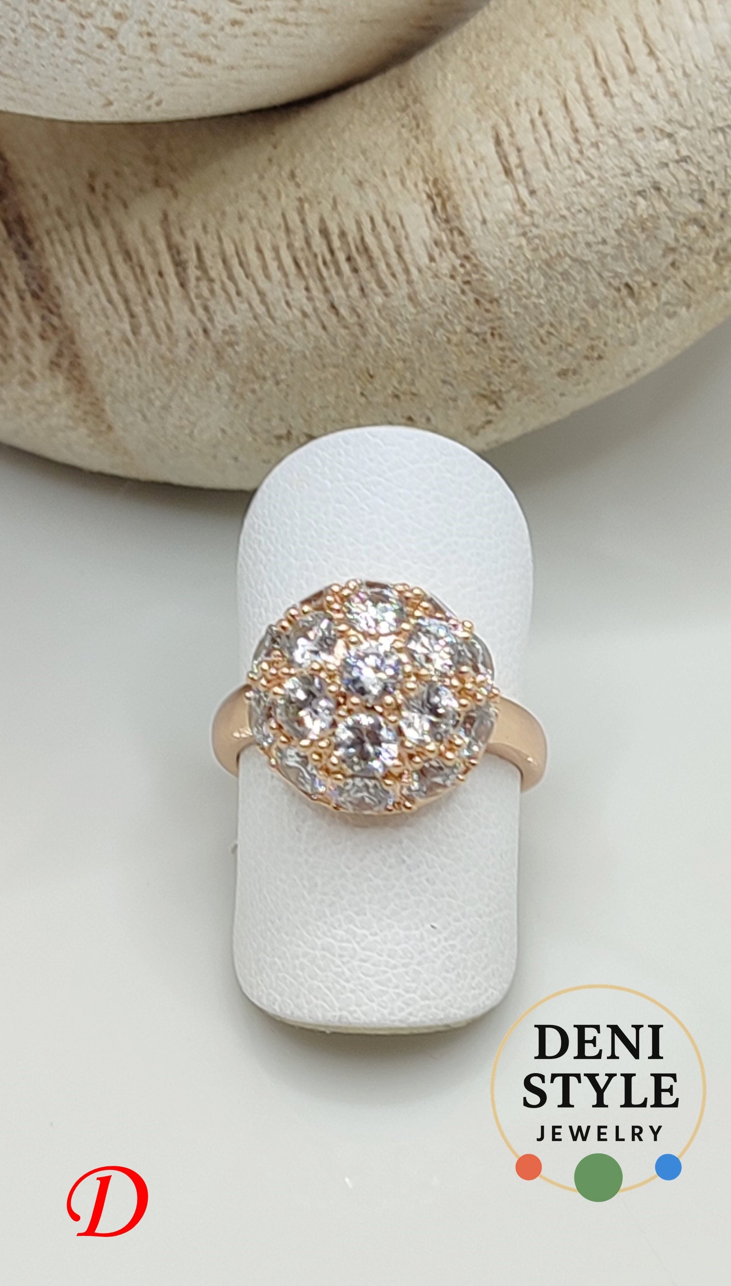 Ez a 18 k színű gyűrű szikrázó kristályokból álló gömb alakú díszítéssel készült, ami minden szögből elbűvölően csillog. Elegáns eseményekhez, különleges alkalmakra – vagy ha egyszerűen szereted a figyelmet! 💫
