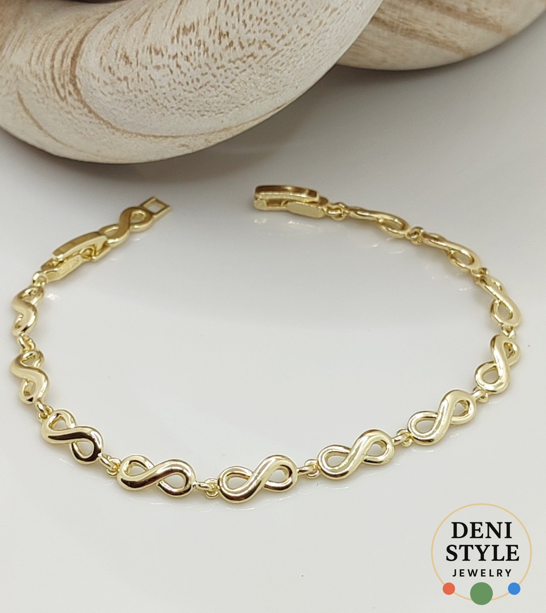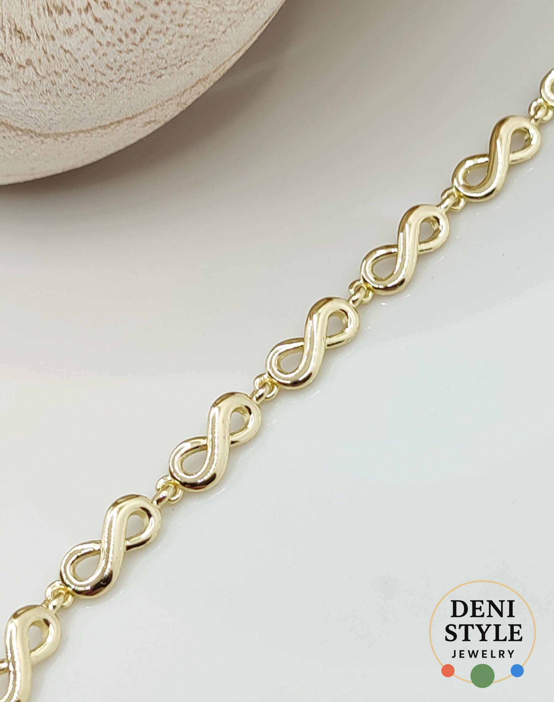A karkötő a végtelen eleganciát és az örök kapcsolat szimbólumát hordozza. Aranyszínű, végtelen jeleket formázó láncszemei finom, nőies megjelenést kölcsönöznek. Antiallergén anyagból készült, így érzékeny bőrűek számára is biztonságos választás. Letisztult, mégis különleges darab, amely tökéletes ajándék szerelem, barátság vagy önmagunk kifejezésére.
