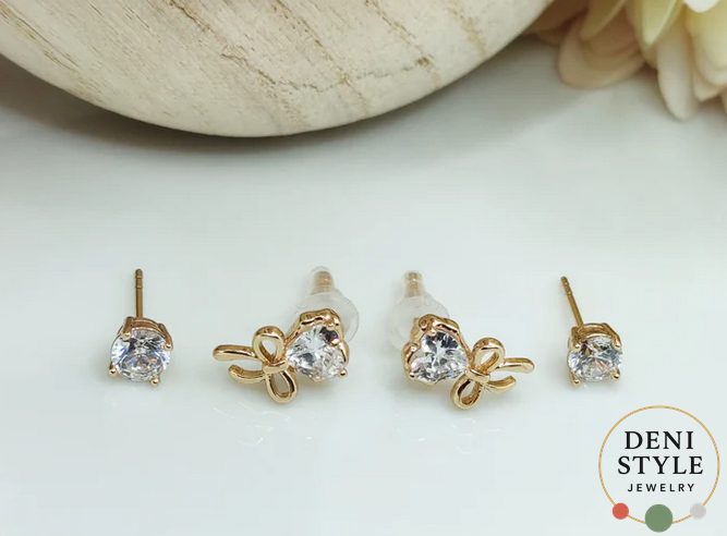 Elegáns fülbevaló szett, amely kétféle stílust kínál: a klasszikus kerek kő és a masnis díszítésű darab tökéletes harmóniát alkot. Különleges választás mindennapokra és alkalmakra egyaránt.