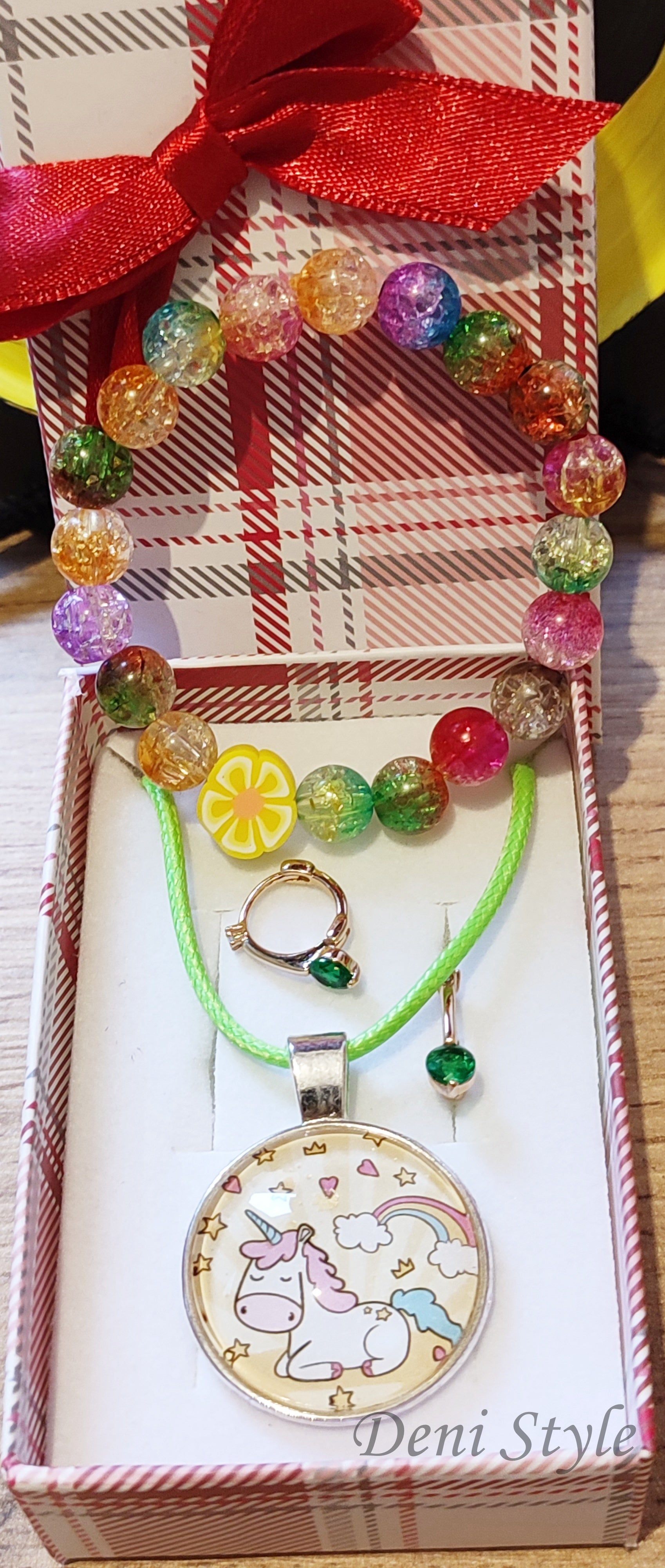 Színes gyöngyös karkötő, bájos unikornisos medálos nyaklánccal és csillogó fülbevalóval – minden kislány álma ez a szett! 🌈🎀
