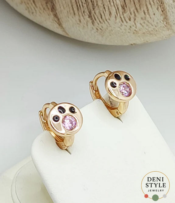 Aranyos gyermek fülbevaló rózsaszín kristállyal és vidám mintával. Könnyed, kényelmes viselet, amely játékosan feldobja a mindennapokat.