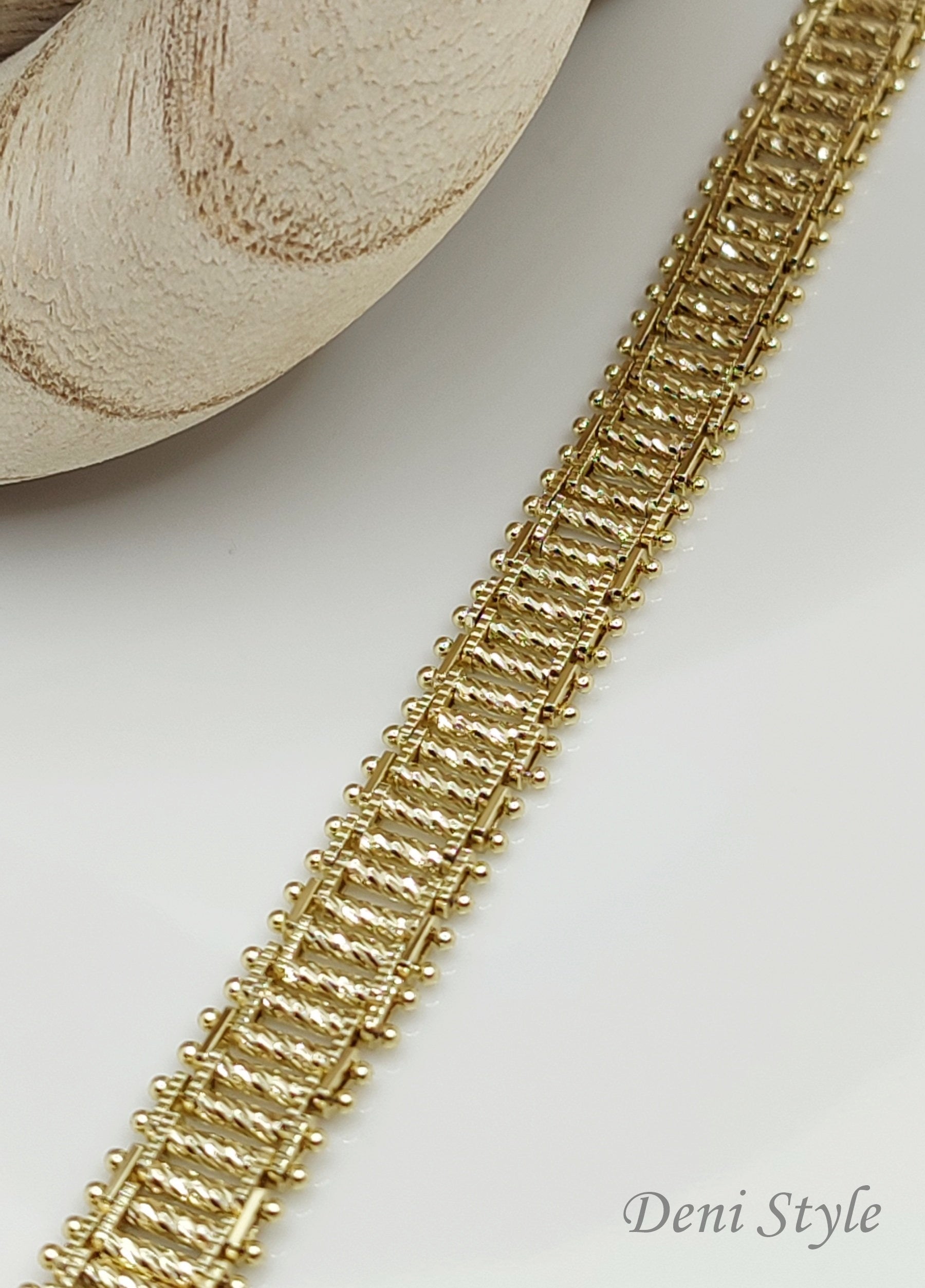 A karkötő a klasszikus elegancia megtestesítője. Arany fényben ragyogó, sűrű szövésű mintája különleges struktúrát ad, amely minden mozdulatnál életre kel. Egyedi megjelenése miatt tökéletes választás ünnepi alkalmakra és mindennapi viseletre is. Antiallergén kialakításának köszönhetően fémérzékenyek számára is biztonságos.