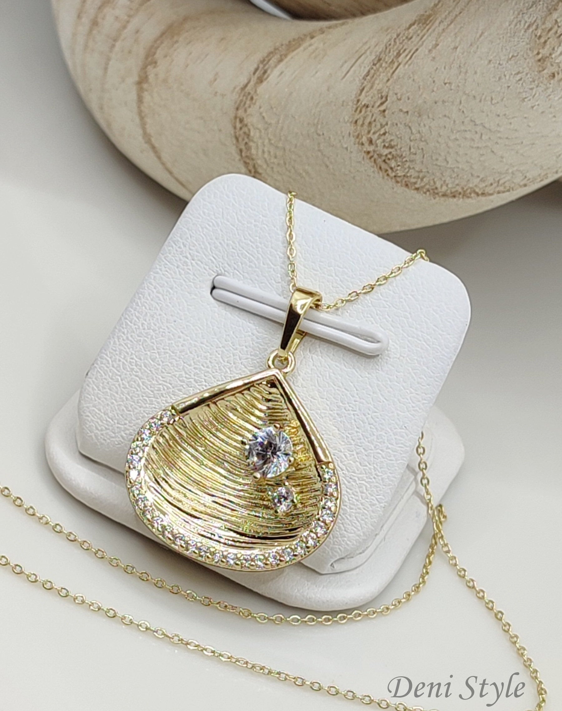 Elegáns nyaklánc, kagyló formájú, csillogó kövekkel díszített medállal, amely igazán különlegessé teszi a megjelenést.