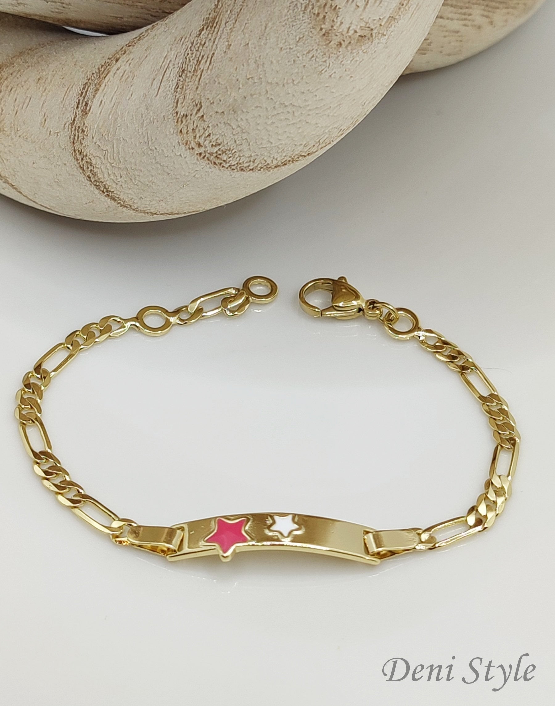 Arany színű karkötő, amelyet rózsaszín és fehér csillag motívum díszít. Vidám és játékos ékszer, amely tökéletes ajándék gyermekek számára. Antiallergén kialakításának köszönhetően fémérzékenyek is biztonsággal viselhetik.