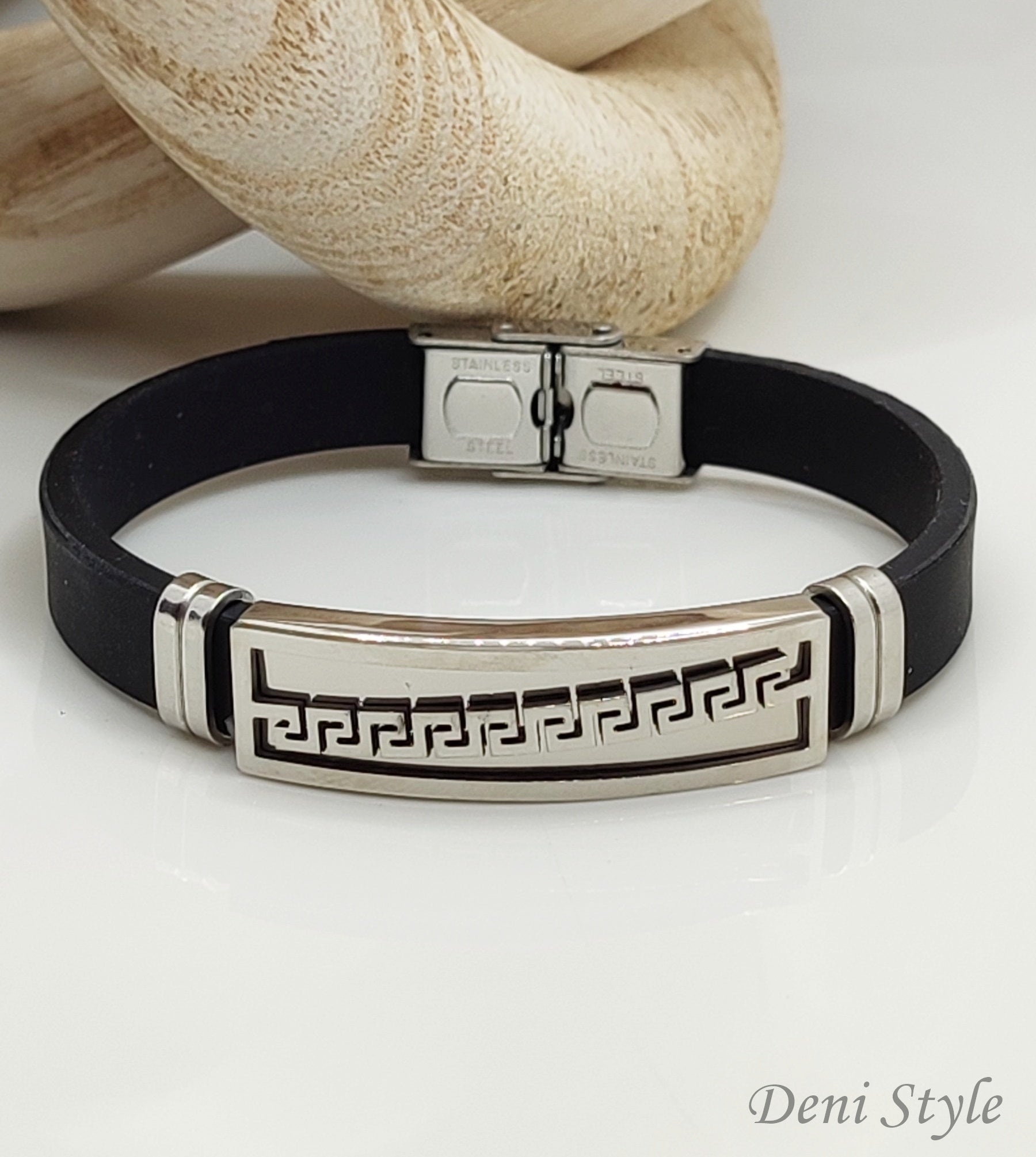 Fekete kaucsuk és nemesacél kombinációja, különleges mintával díszítve 💥