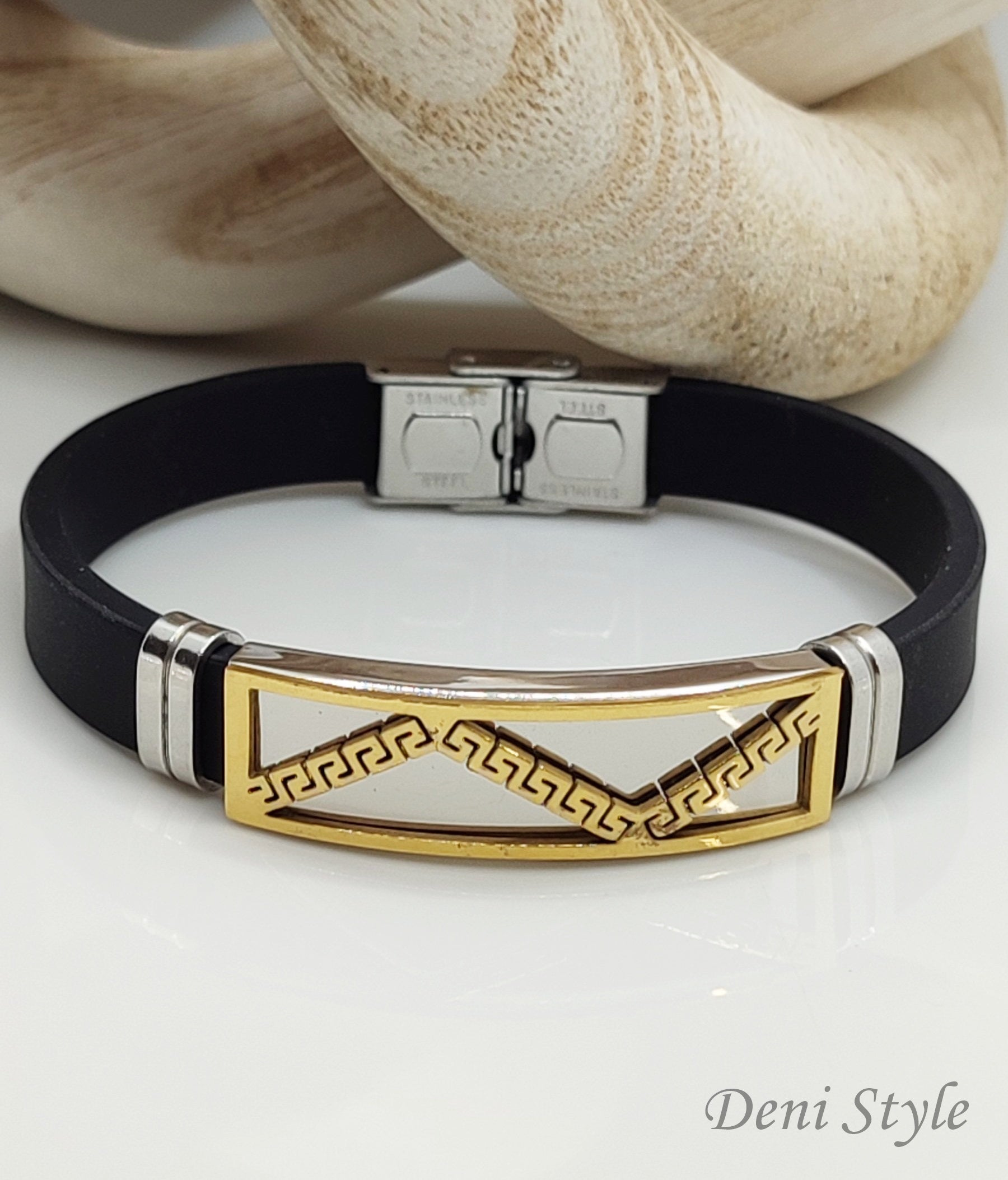 Fekete kaucsuk karkötő arany-nemesacél díszítéssel és görög mintával 🖤💛