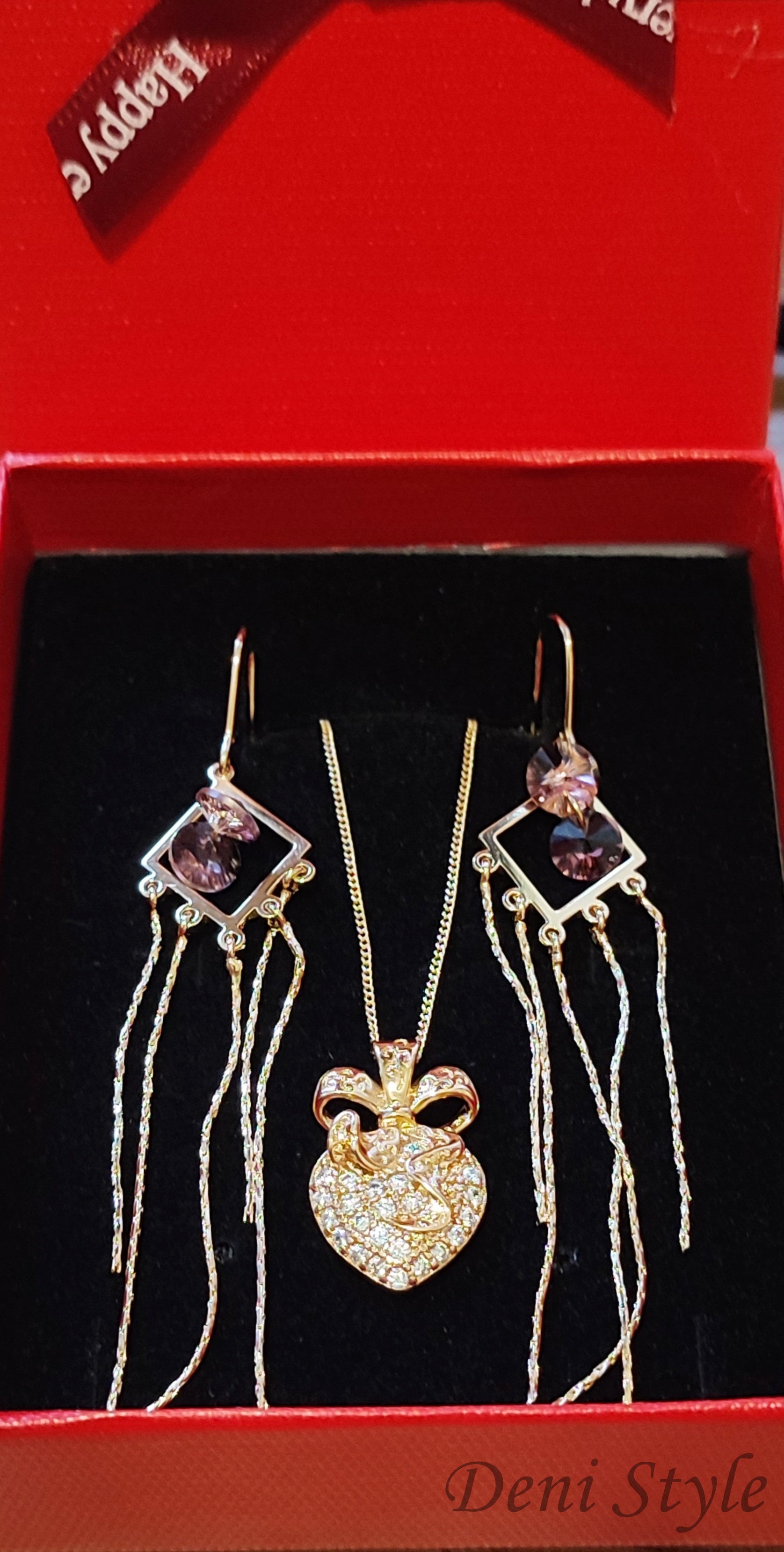 Ez az arany színű, kristályos szívmedállal díszített nyaklánc és a hosszú láncos, lila kristállyal kombinált fülbevaló egyszerre elegáns, romantikus és stílusos! 🌹