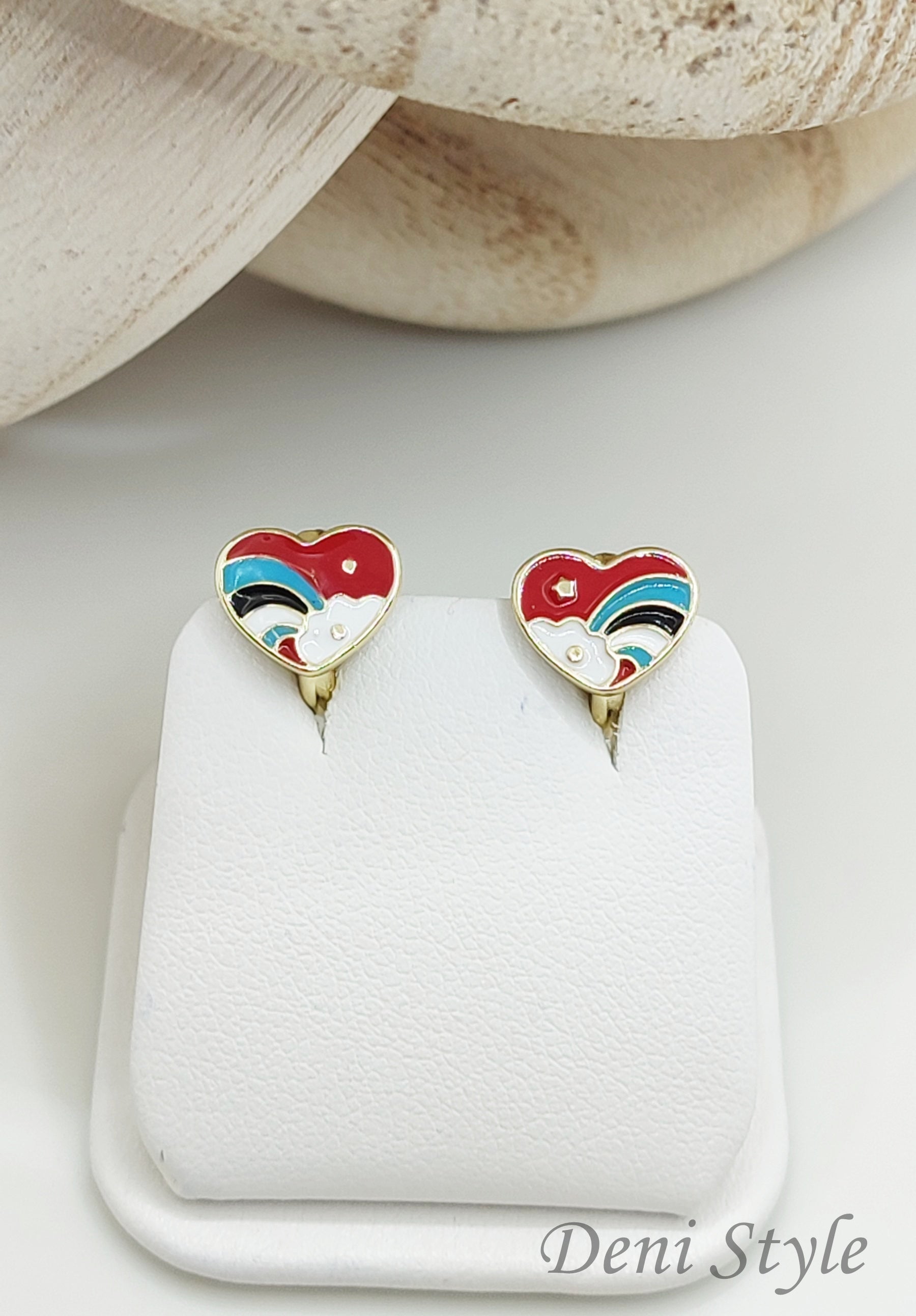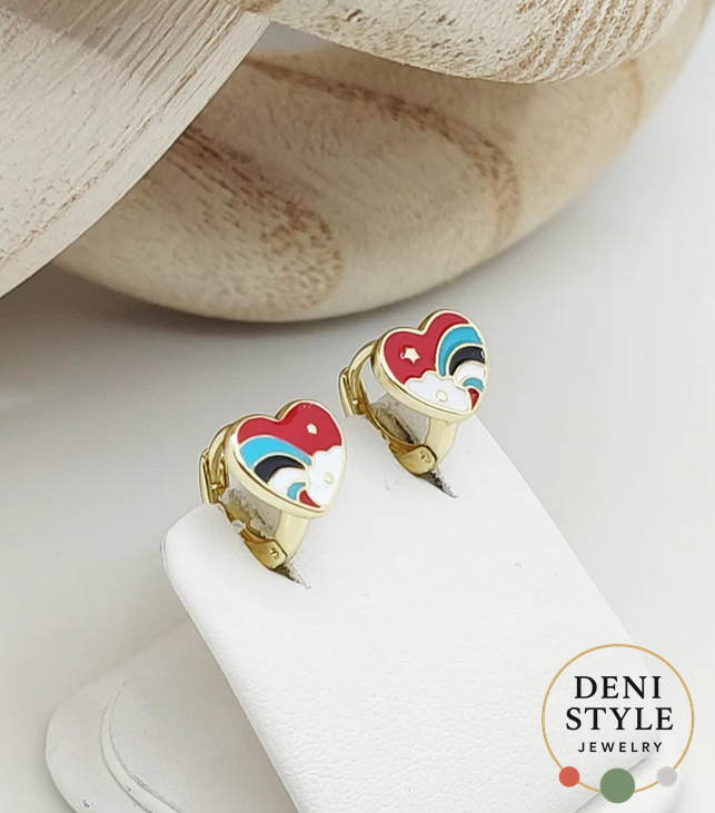 Vidám és bájos gyermek fülbevaló, amely színes szív és szivárvány mintával díszített. Kényelmes és biztonságos viselet a mindennapokra, játékos stílusa pedig mosolyt csal a kicsik arcára. Antiallergén anyagból készült, így érzékeny bőrű gyermekek számára is ideális választás.