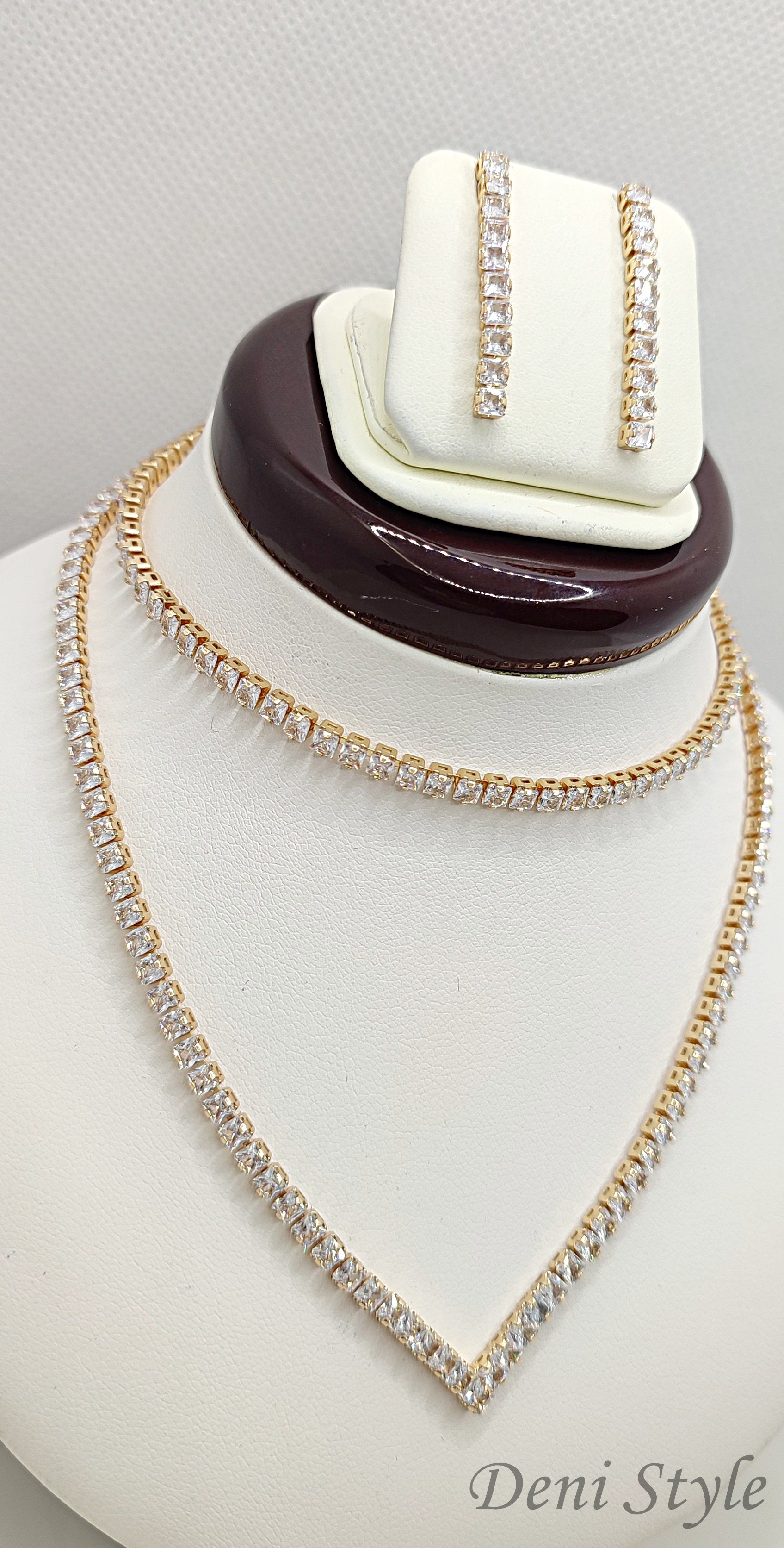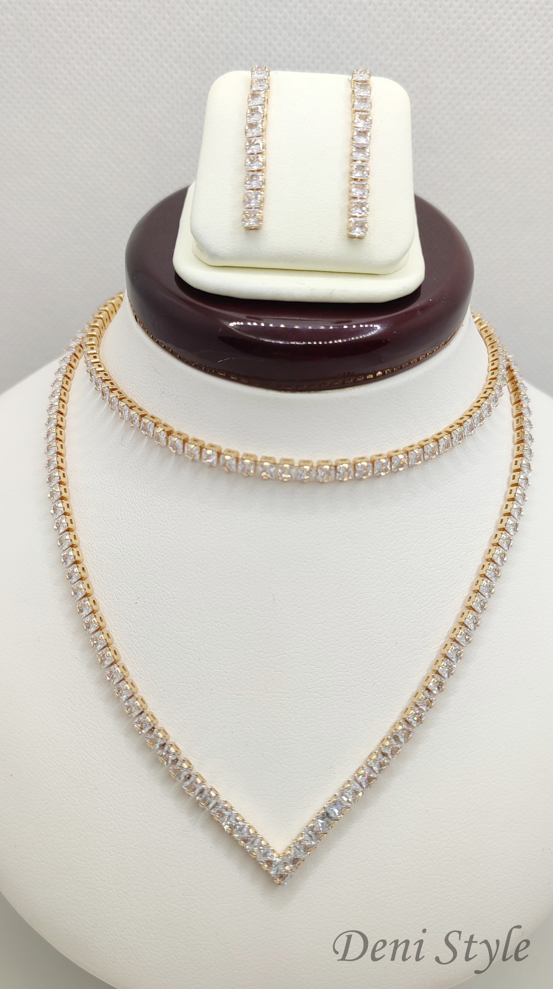 Aranyszínű, antiallergén nyaklánc–fülbevaló–karkötő szett, amely a kifinomultság és elegancia tökéletes egységét kínálja.
