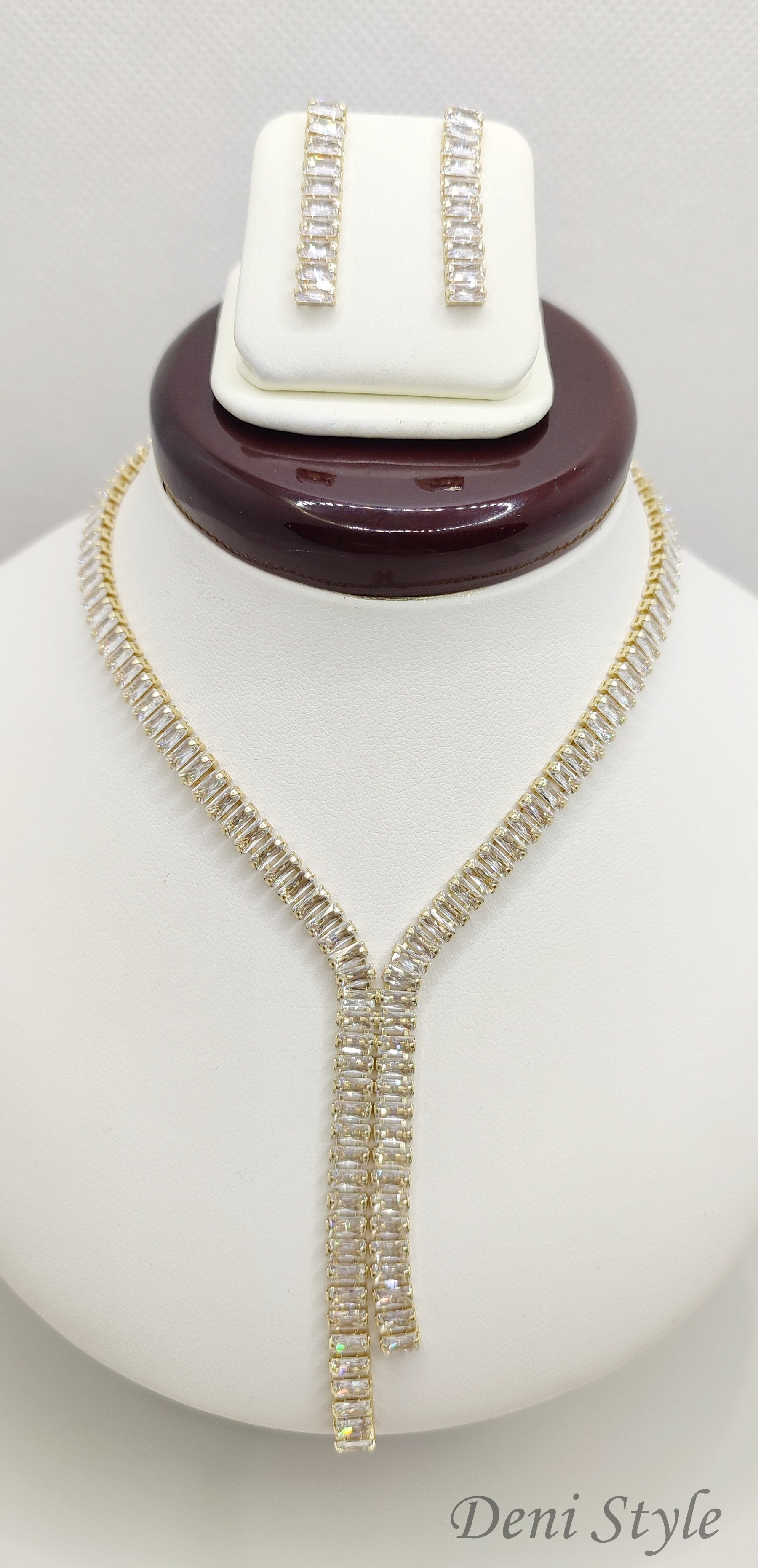 Finoman csillogó köveinek sorozata elegáns “Y” formát alkot, kiemelve a nyak vonalát.