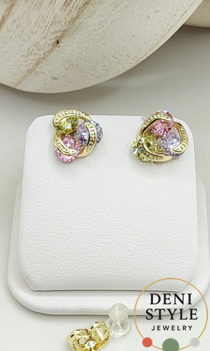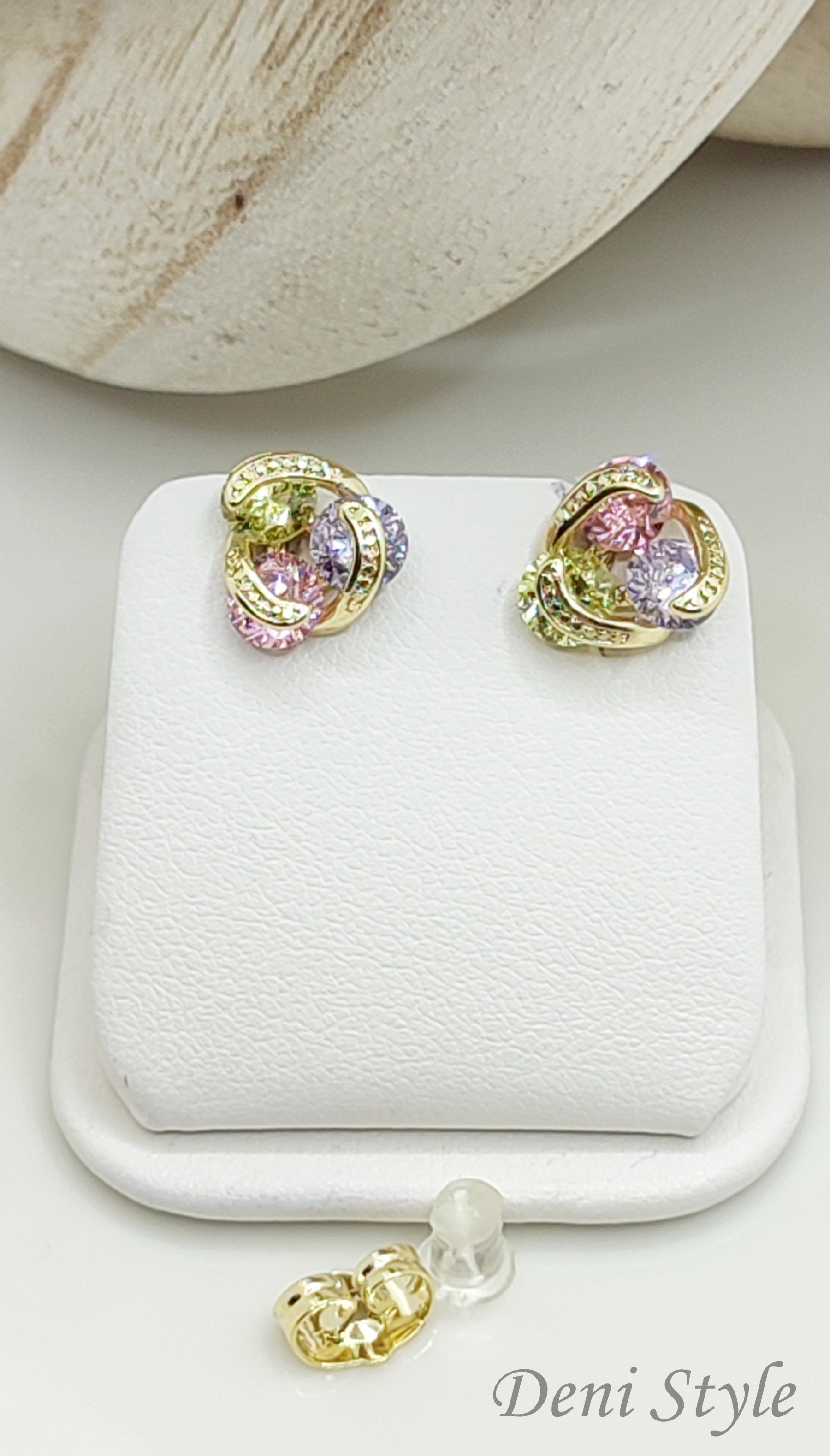 Különleges színvilágú fülbevaló, amelyben rózsaszín, lila és zöld kristályok ragyognak elegáns arany keretben. Vidám, mégis elegáns kiegészítő, amely feldobja a mindennapi megjelenést és ünnepi alkalmakhoz is tökéletes. Antiallergén anyagból készült, így érzékeny bőrűeknek is ajánlott.