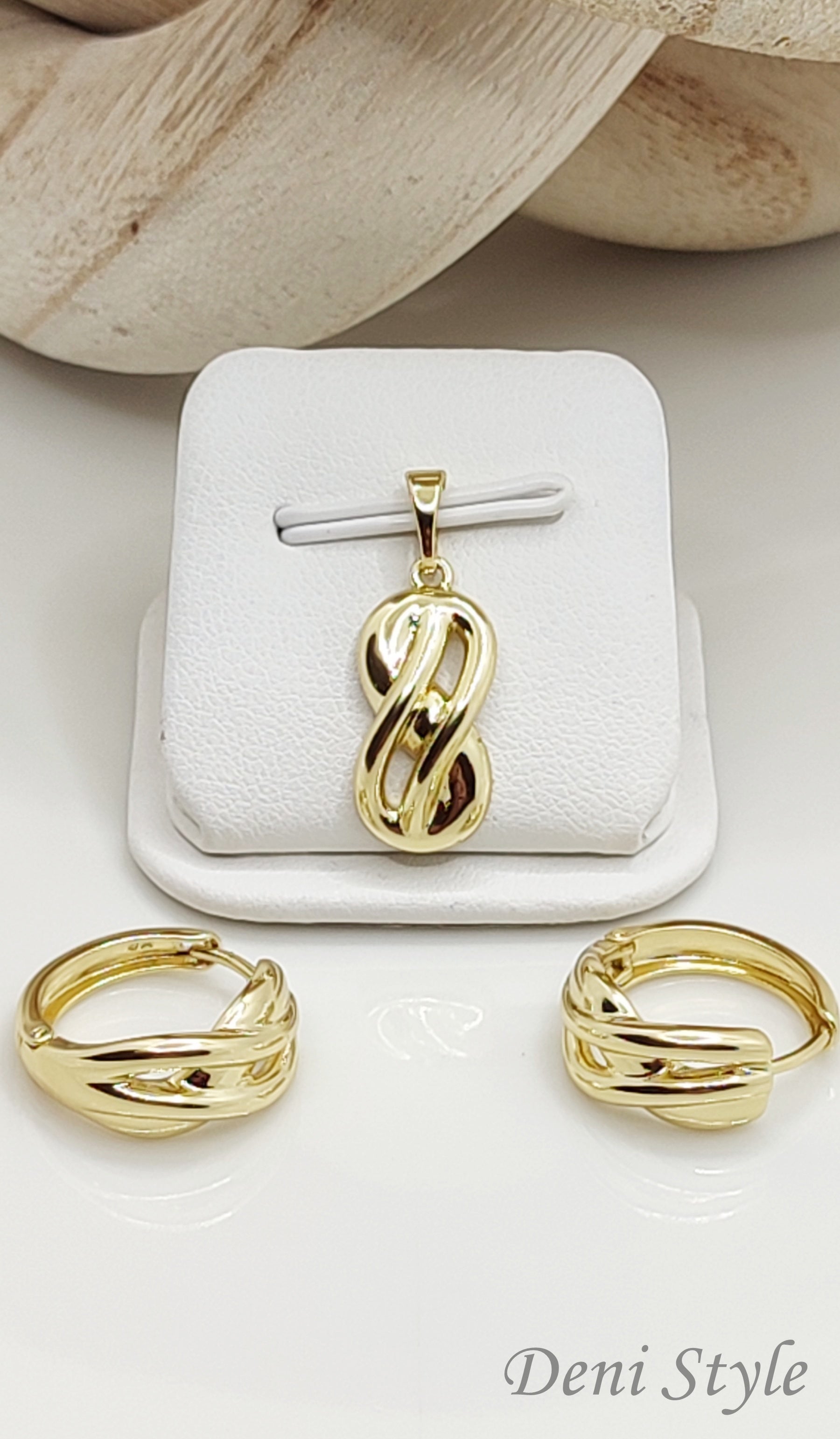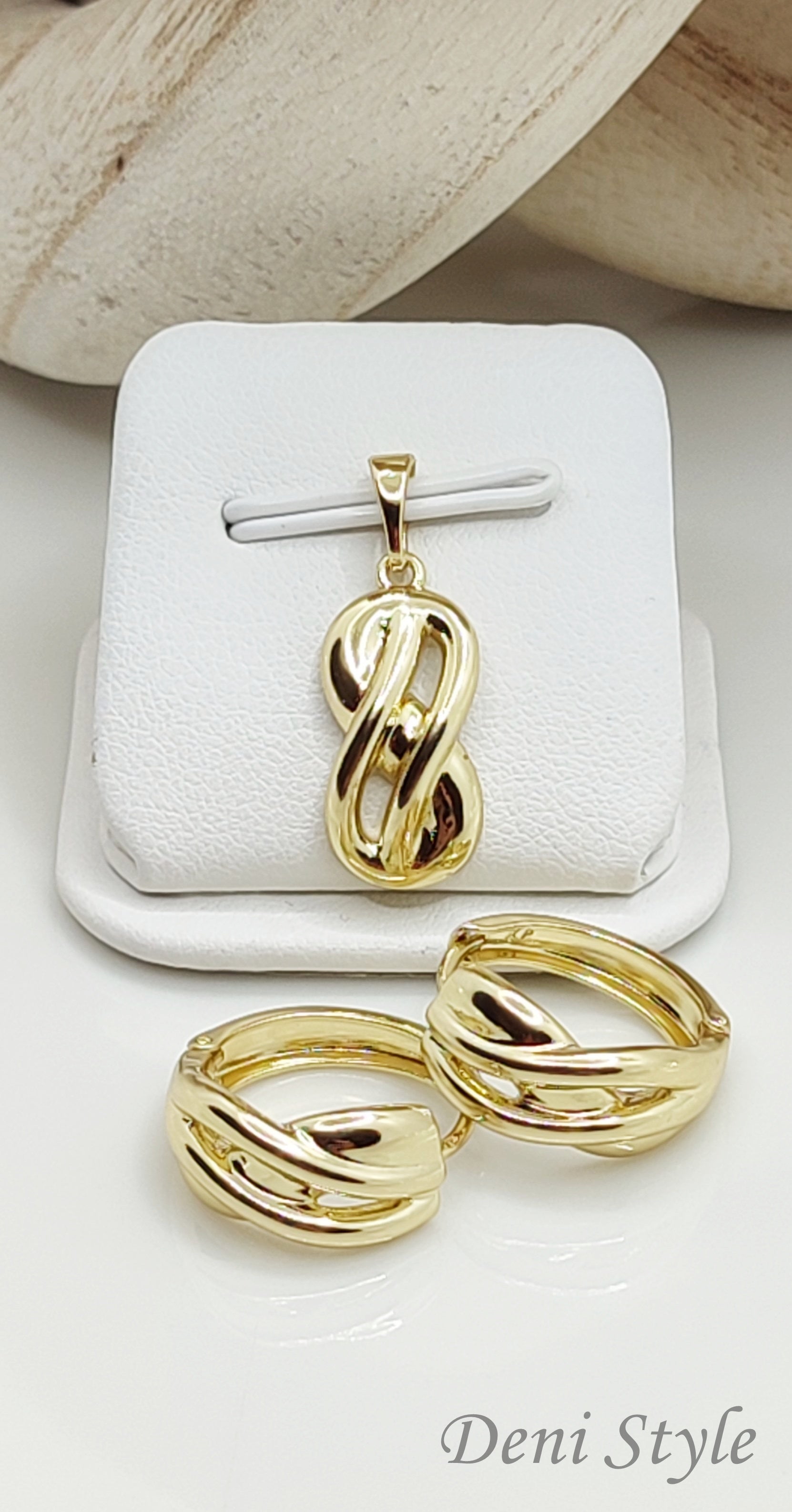 Elegáns, aranyszínű antiallergén ékszerszett, amely fülbevalót és medált tartalmaz.