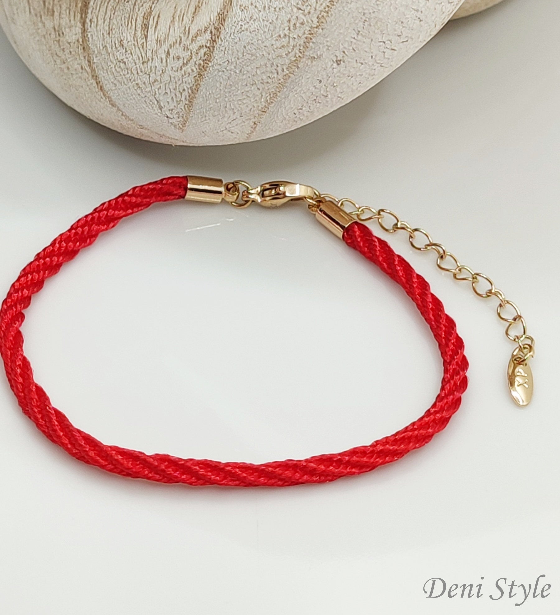Egyszerű, mégis erőteljes hatású piros fonott karkötő aranyszínű kiegészítőkkel. A piros szín a szerencsét, a védelmet és az energiát hordozza, így különleges jelentést ad ennek a modern, mindennapokban is viselhető darabnak.