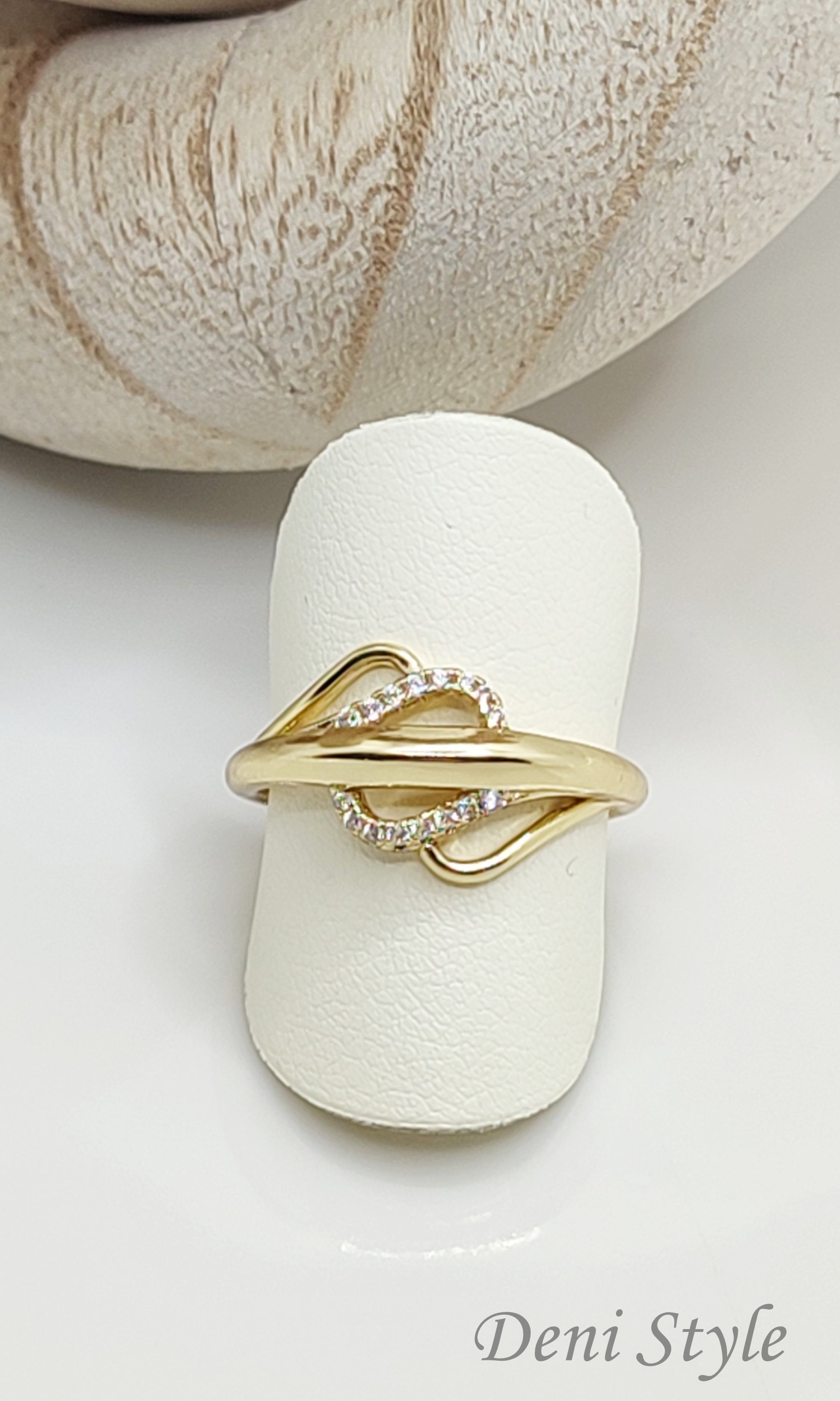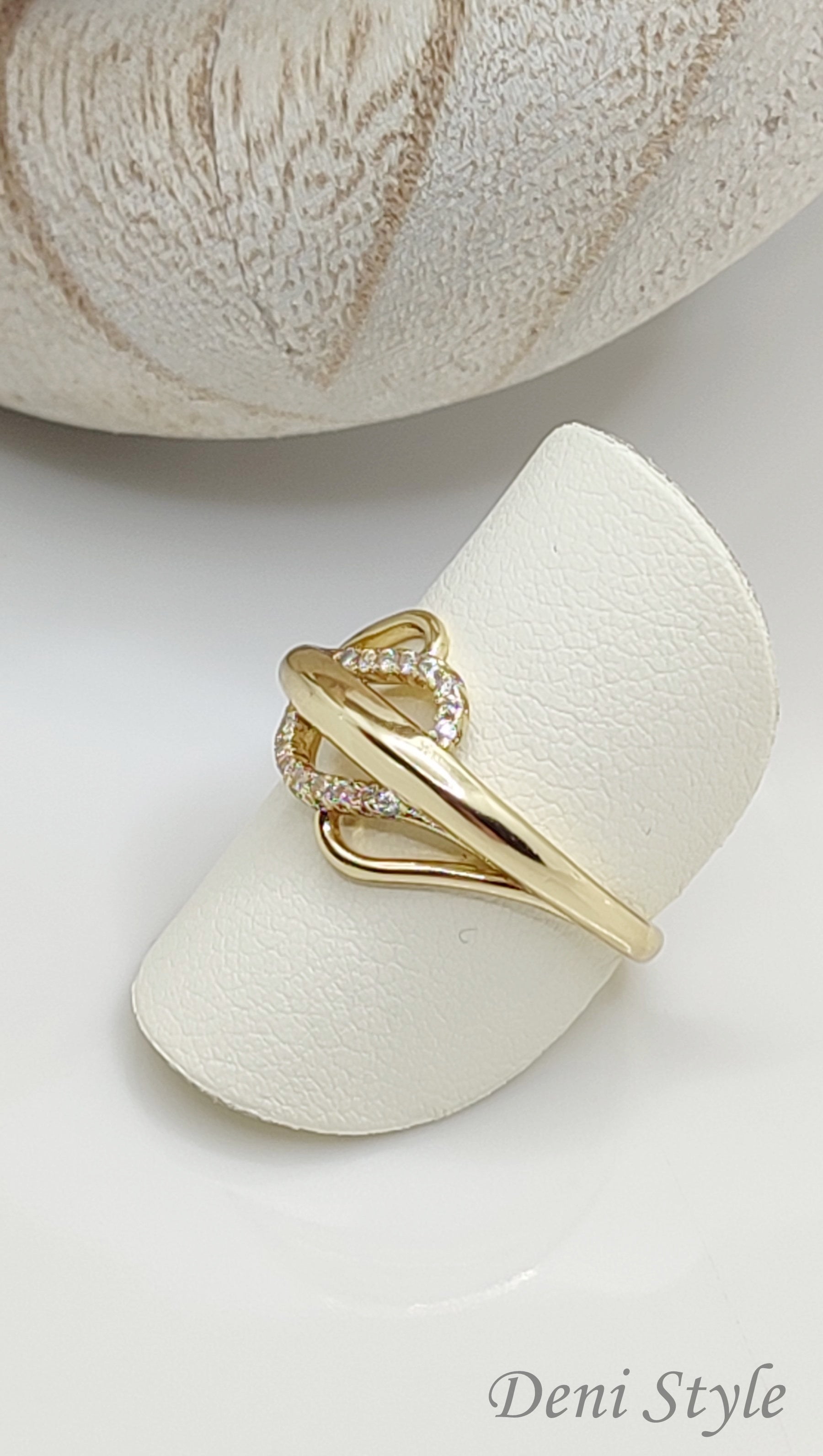 Arany színű gyűrű, amelyet finoman ívelt, egymásba fonódó vonalak alkotnak. A középső részben apró kristályok csillognak, kiemelve a különleges formavilágot. Elegáns és egyedi kiegészítő, amely tökéletes választás a nőies, kifinomult megjelenéshez.