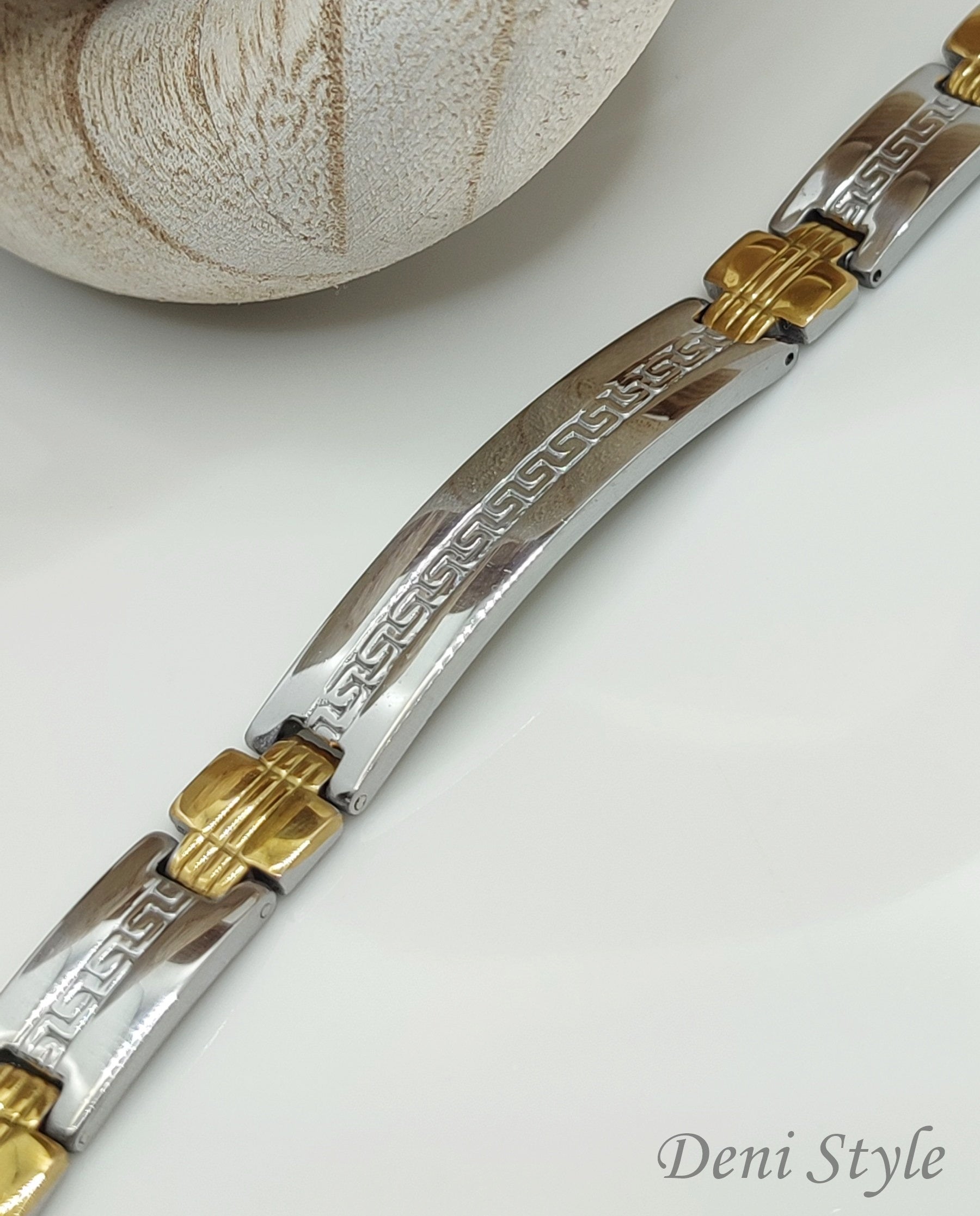 ✨💫 Ez a kétszínű, ezüst–arany karkötő 💛🔗 finoman játszik a klasszikus görög kulcsmintával, miközben tökéletesen simul a csuklódra. 😊👌Legyen szó hétköznapi farmer+póló kombóról vagy elegáns alkalmi szettről, ez a karkötő garantáltan feldobja a megjelenésedet 🎉👗!