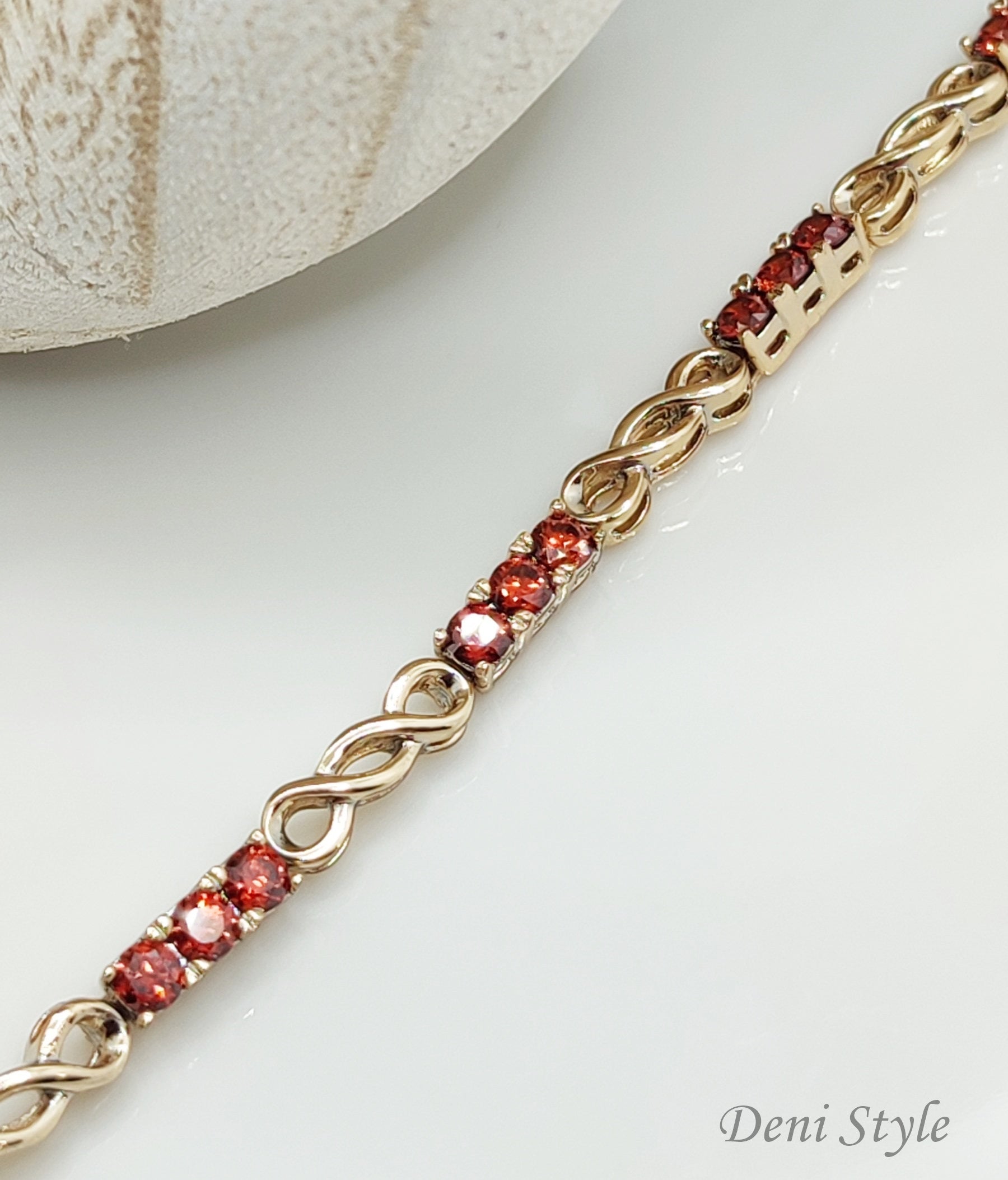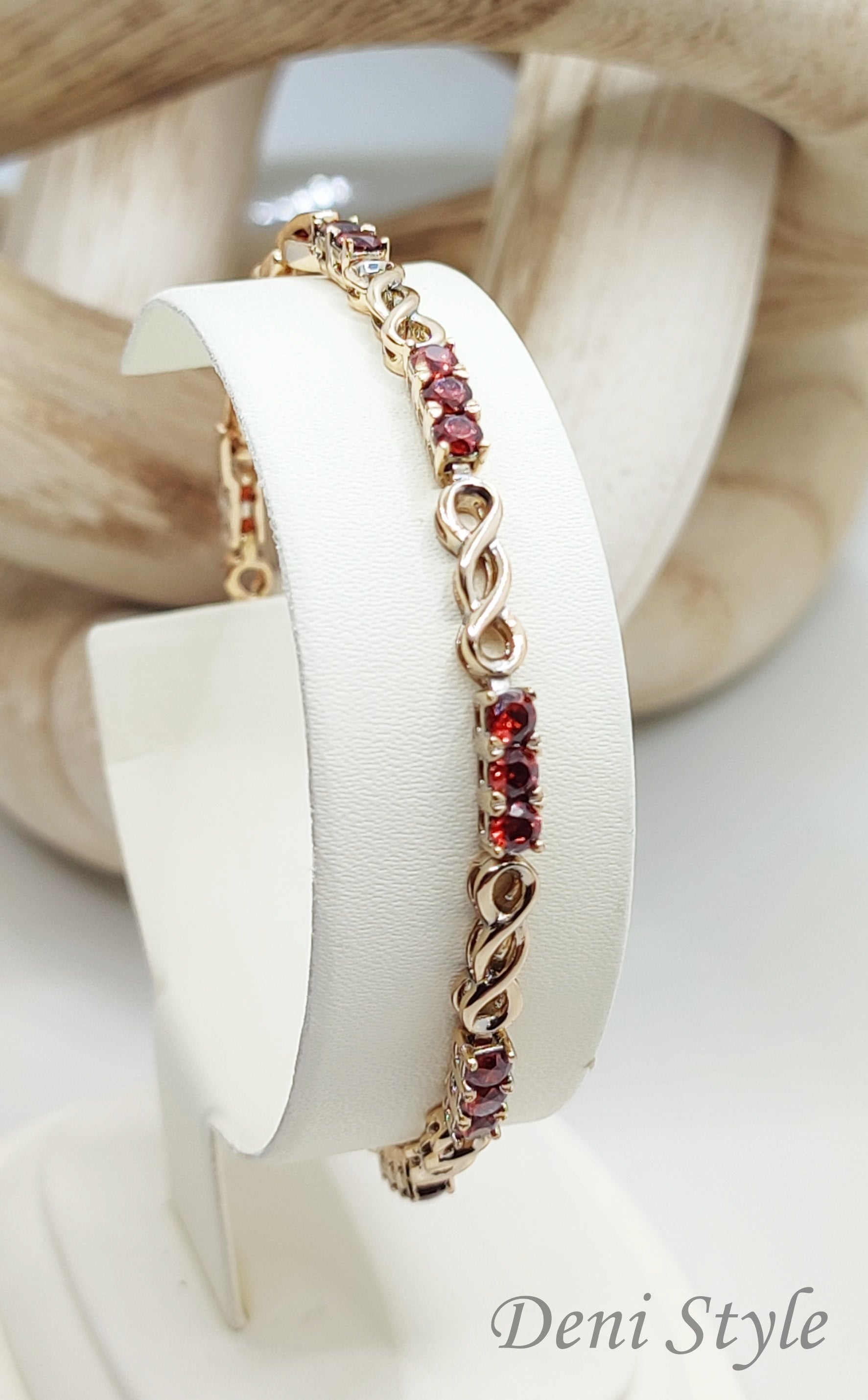 Aranyszínű karkötő végtelen szimbólum motívumokkal és ragyogó vörös kristályokkal, amelyek a szerelem és a szenvedély erejét hozzák el. Egy időtlen ékszer, amely tökéletes ajándék lehet különleges alkalmakra is. Antiallergén kialakítása miatt fémérzékenyek számára is biztonságosan viselhető.