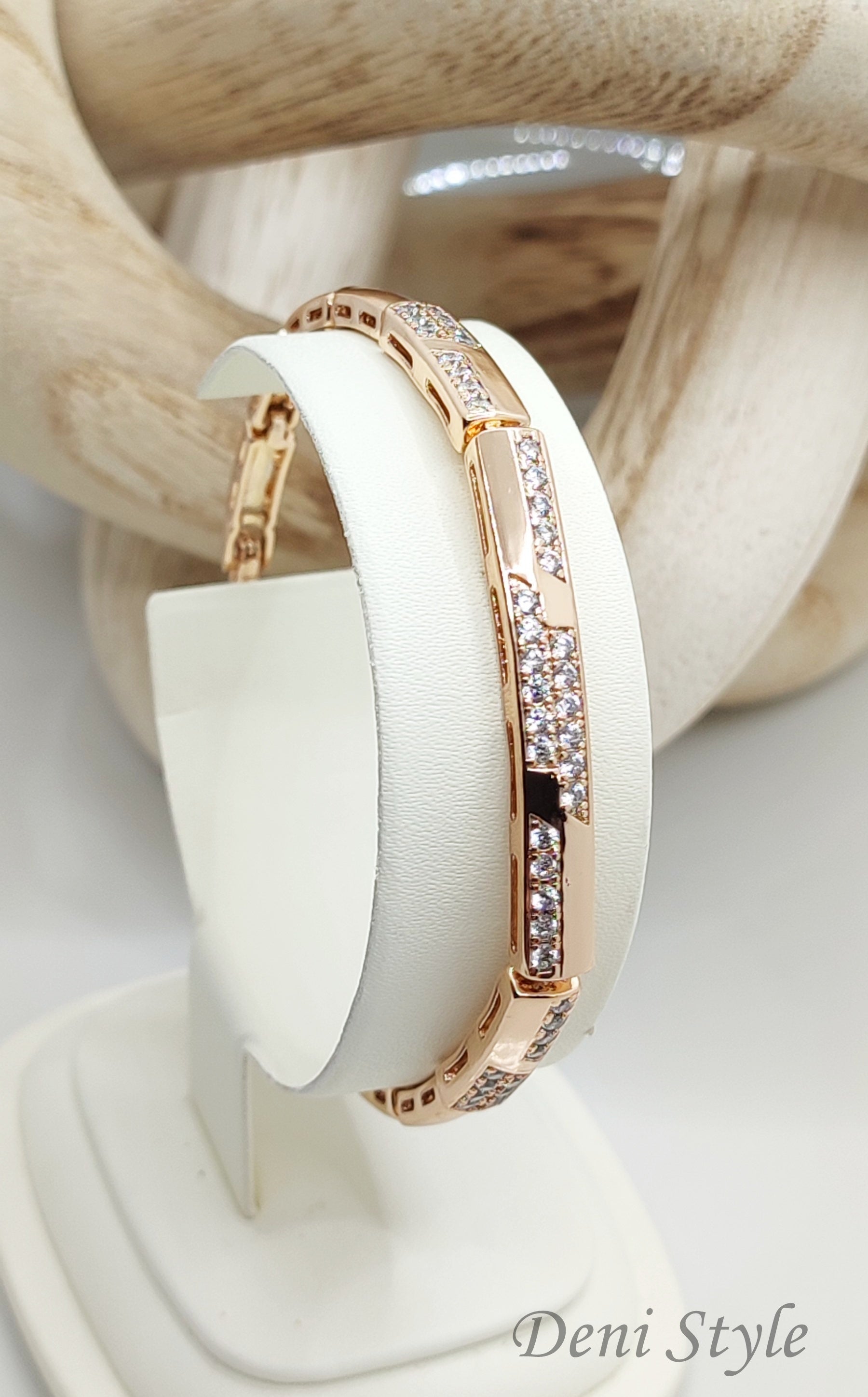Stílusos arany színű karkötő, amelyet finoman elrendezett, ragyogó kövek tesznek különlegessé. Elegáns és modern kialakításának köszönhetően tökéletes választás ünnepi alkalmakhoz és hétköznapi viselethez is. Antiallergén anyagból készült, így fémérzékenyek számára is biztonságos.