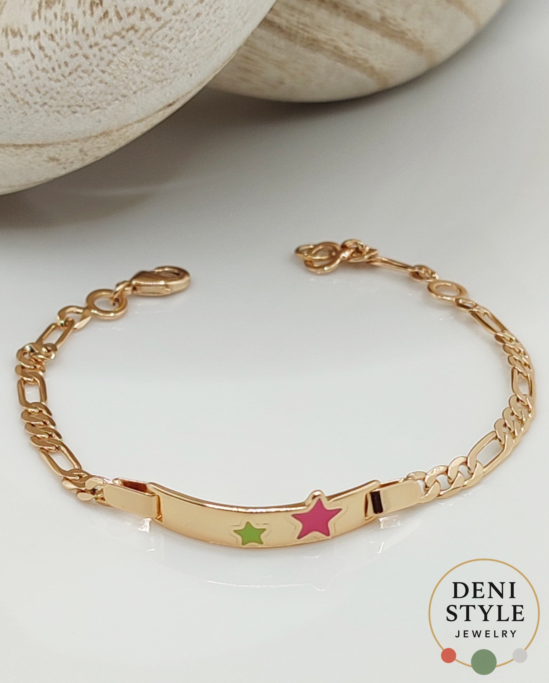 Arany színű karkötő, amelyet rózsaszín és zöld csillag motívum díszít. Vidám és játékos ékszer, amely tökéletes ajándék gyermekek számára. Antiallergén kialakításának köszönhetően fémérzékenyek is biztonsággal viselhetik.