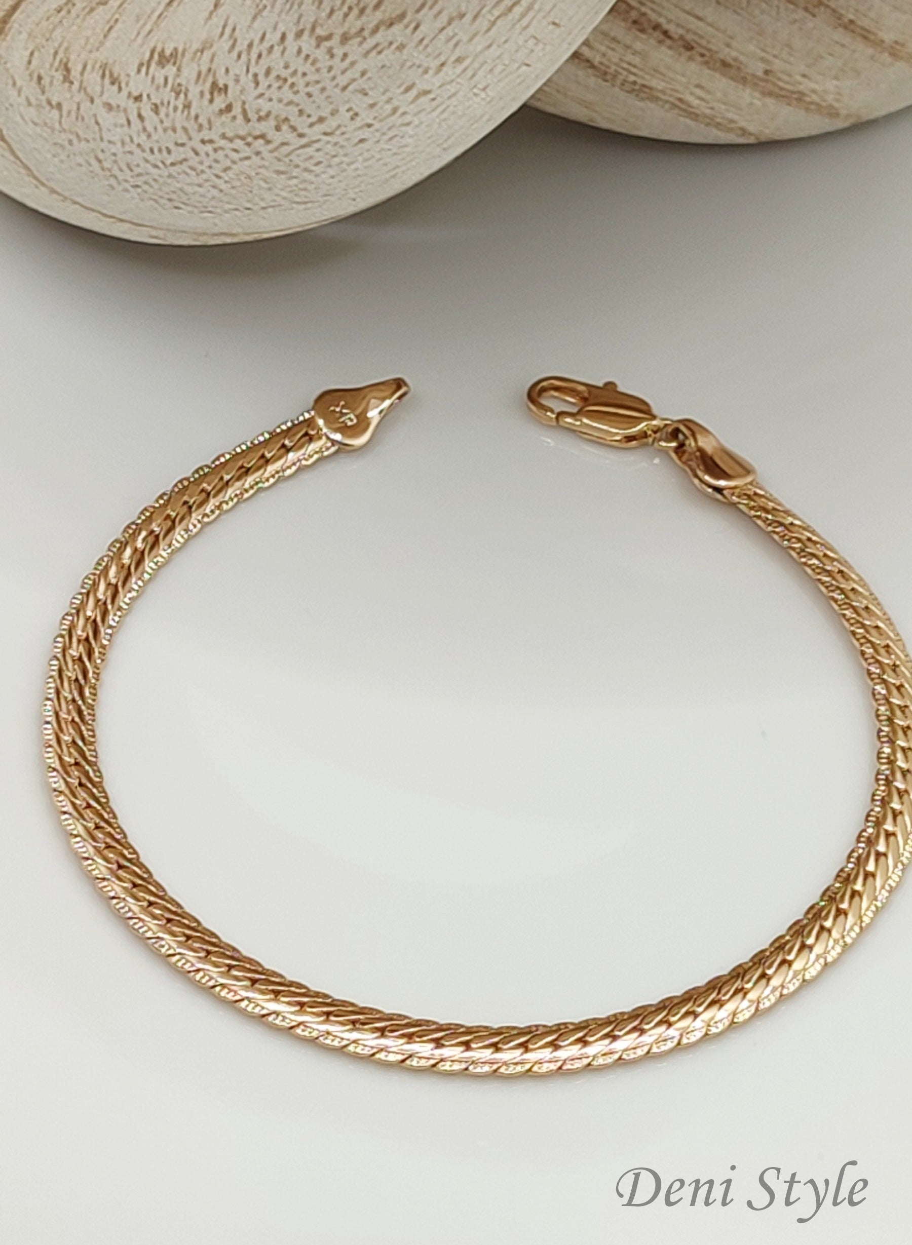 Klasszikusan elegáns arany színű karkötő sűrű, fonott hatású mintázattal. Tökéletes választás mindennapi viselethez, de kifinomult kiegészítője lehet elegáns megjelenésnek is. Antiallergén anyagának köszönhetően fémérzékenyek számára is biztonságosan hordható.