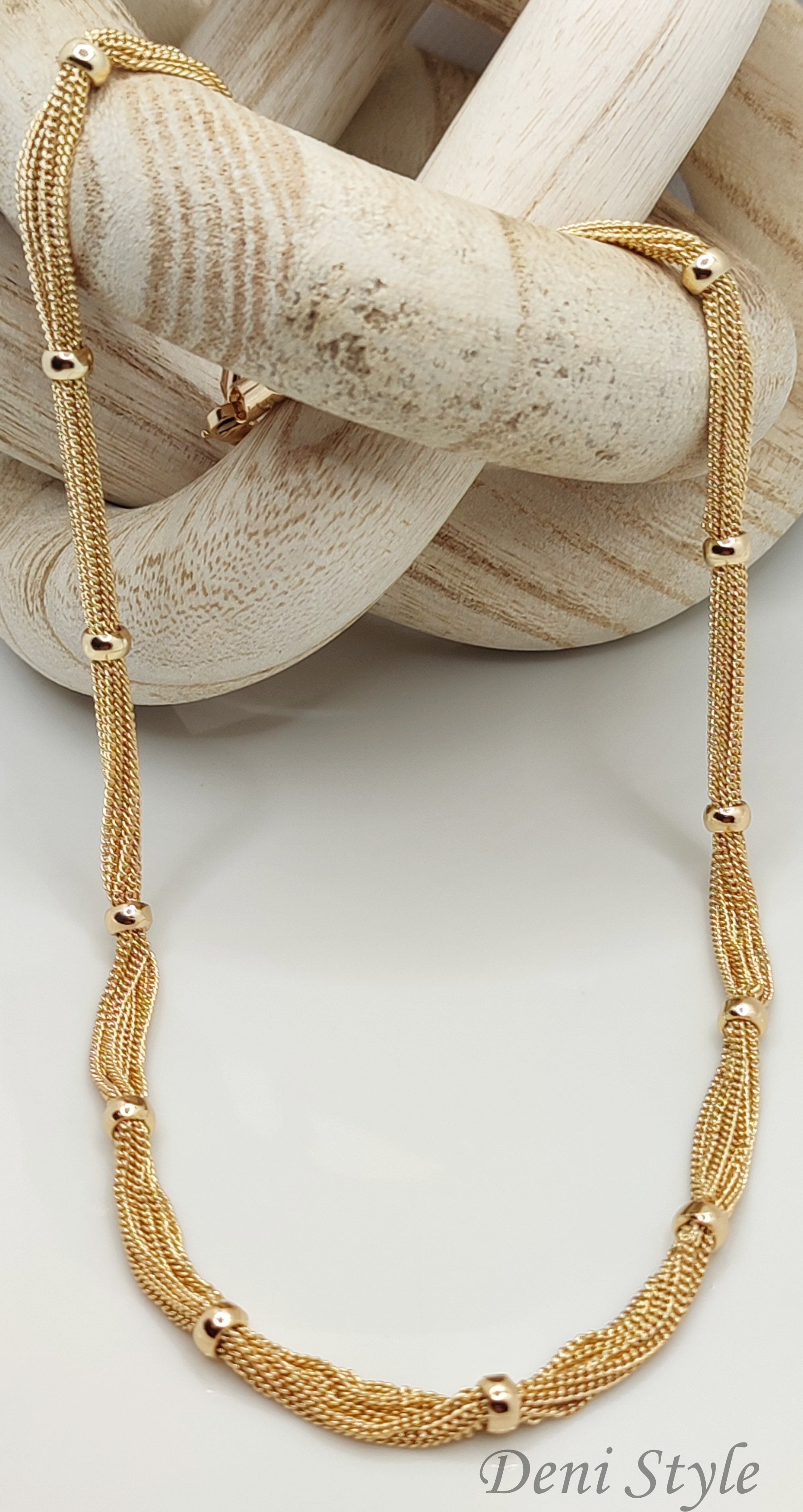 Ez a különleges nyaklánc elegánsan fonott láncszemekből áll, melyeket apró díszgömbök tagolnak.