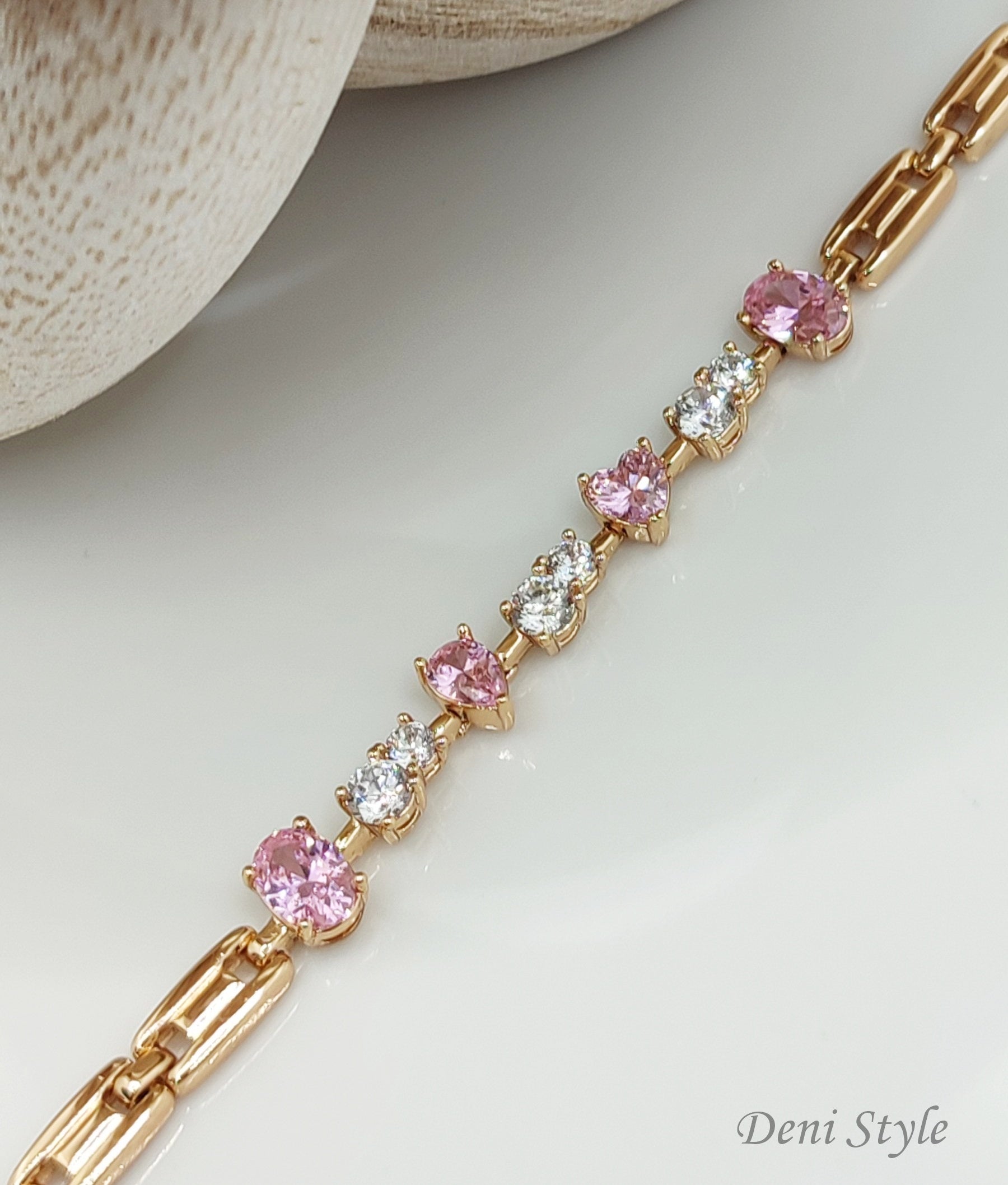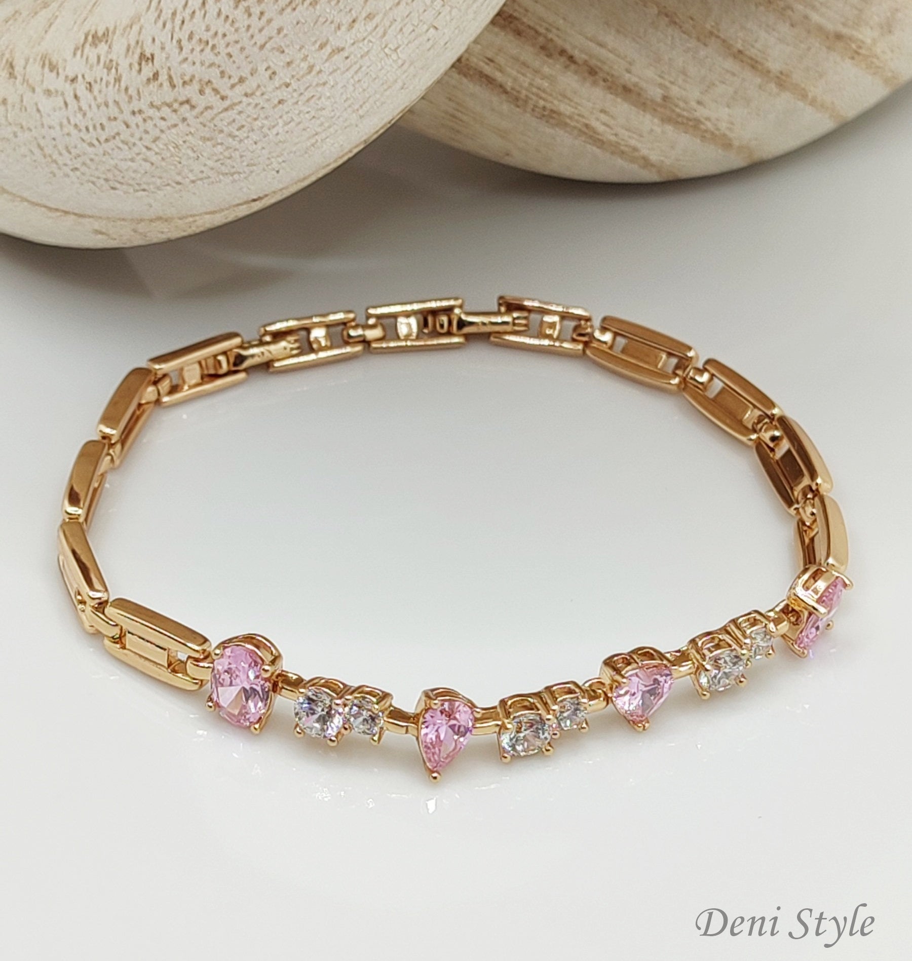 Arany színű karkötő, amelyet váltakozó formájú rózsaszín és áttetsző kövek díszítenek. Légies, romantikus stílusa nőies eleganciát sugároz, amely ünnepi megjelenéshez és mindennapokra is remek választás. Antiallergén kialakításának köszönhetően fémérzékenyek is biztonsággal viselhetik.