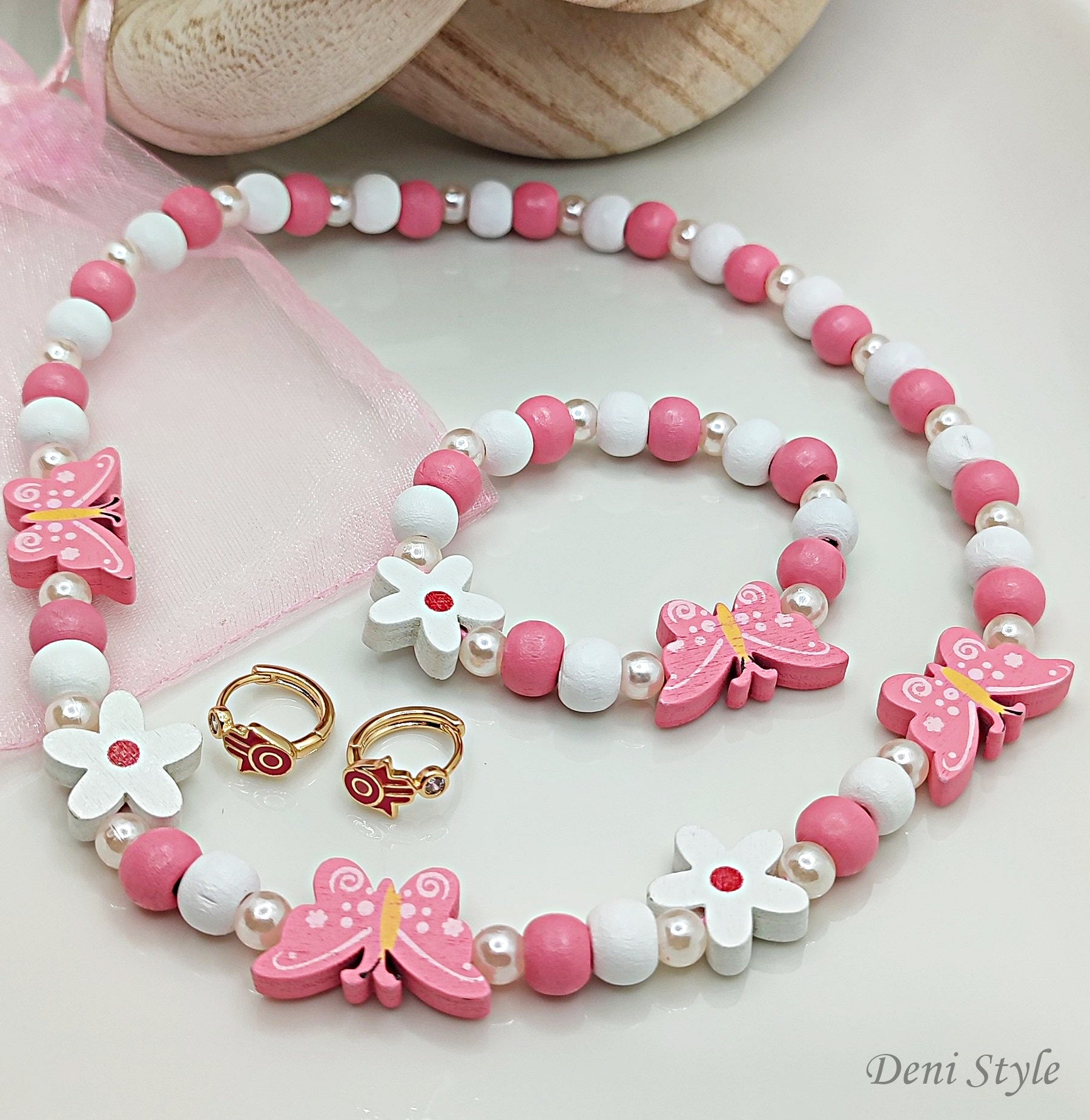 A szett tartalmaz egy nyakláncot, karkötőt és fülbevalópárt – mindezt imádnivaló rózsaszín, fehér és gyöngyház árnyalatokban! 🧚♀️🌸