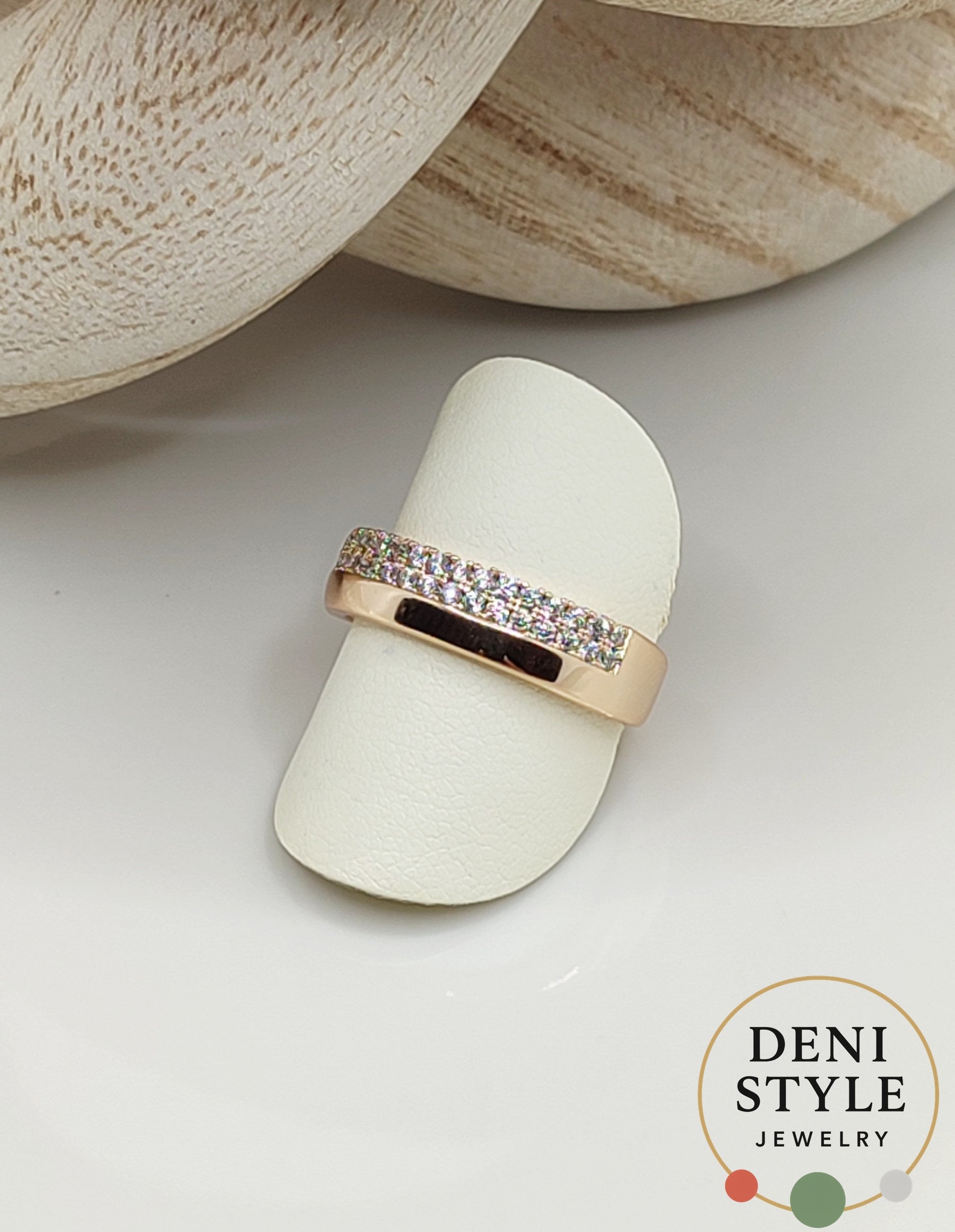 Stílusos, 18 k arany színű gyűrű, amelyet két sorban ragyogó cirkónia kövek díszítenek. Letisztult formája modern eleganciát sugall, így tökéletes választás mindennapi viselethez vagy különleges alkalmakra. Időtálló, mégis kifinomult ékszer, amely bármely megjelenést feldob.