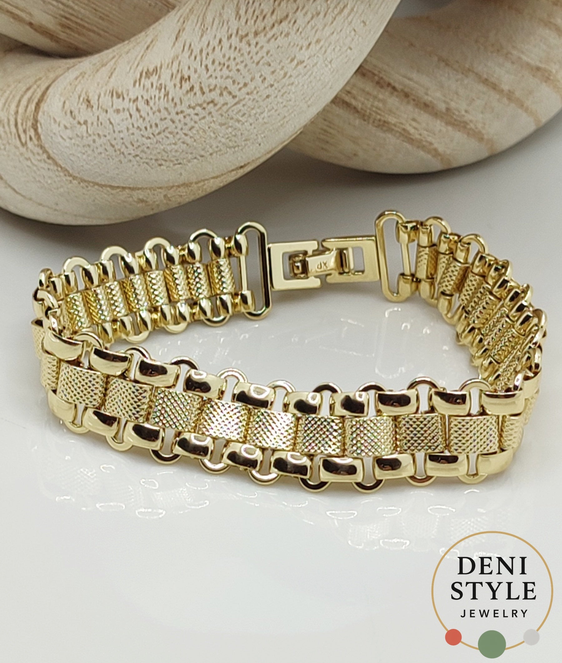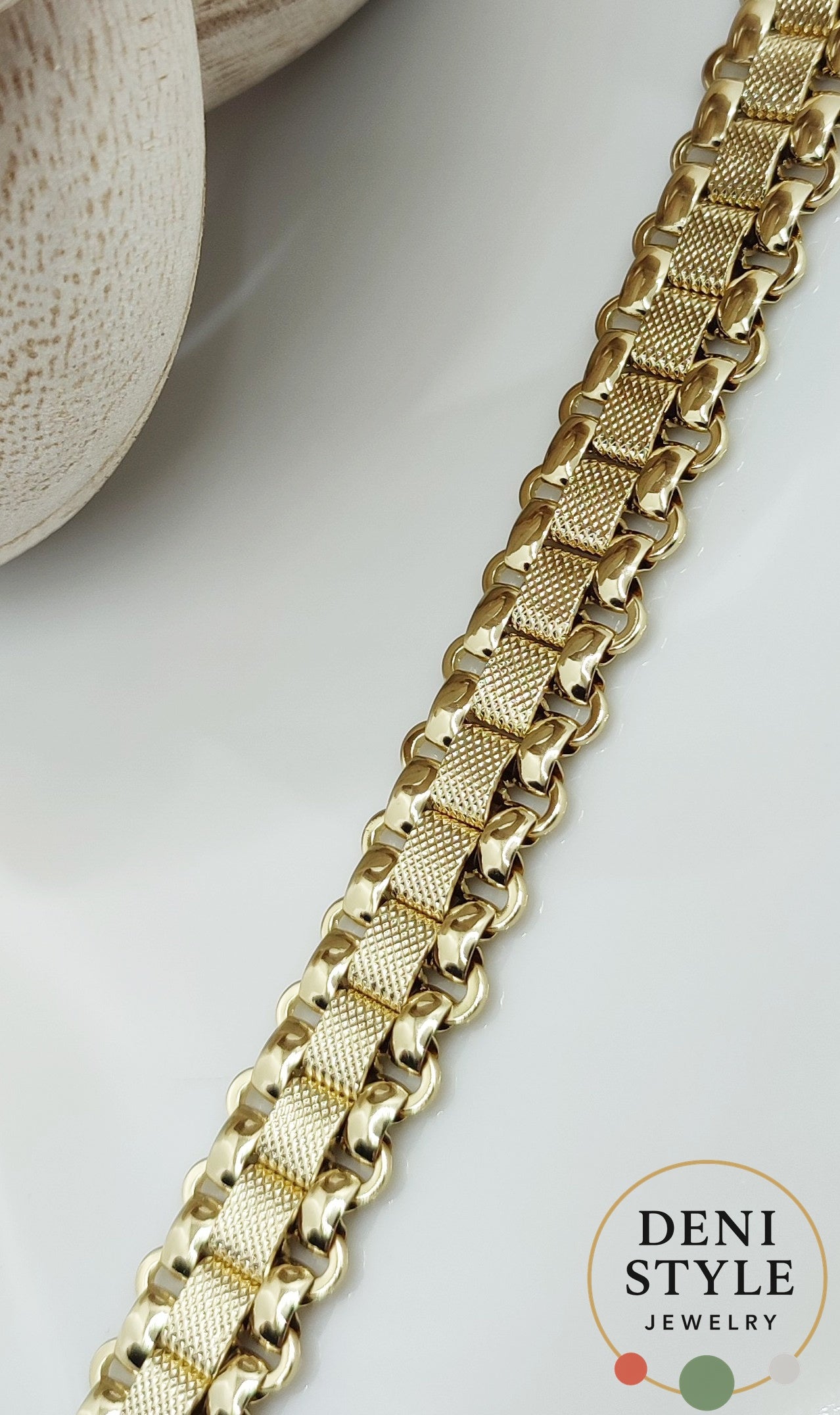 Ez a különleges, arany színű karkötő erőt és eleganciát sugároz. Egyedi láncszemeinek játékos mintázata modern, mégis klasszikus megjelenést kölcsönöz. Antiallergén anyagának köszönhetően érzékeny bőrűek számára is biztonságos választás, amely bármilyen alkalomhoz tökéletesen illik.