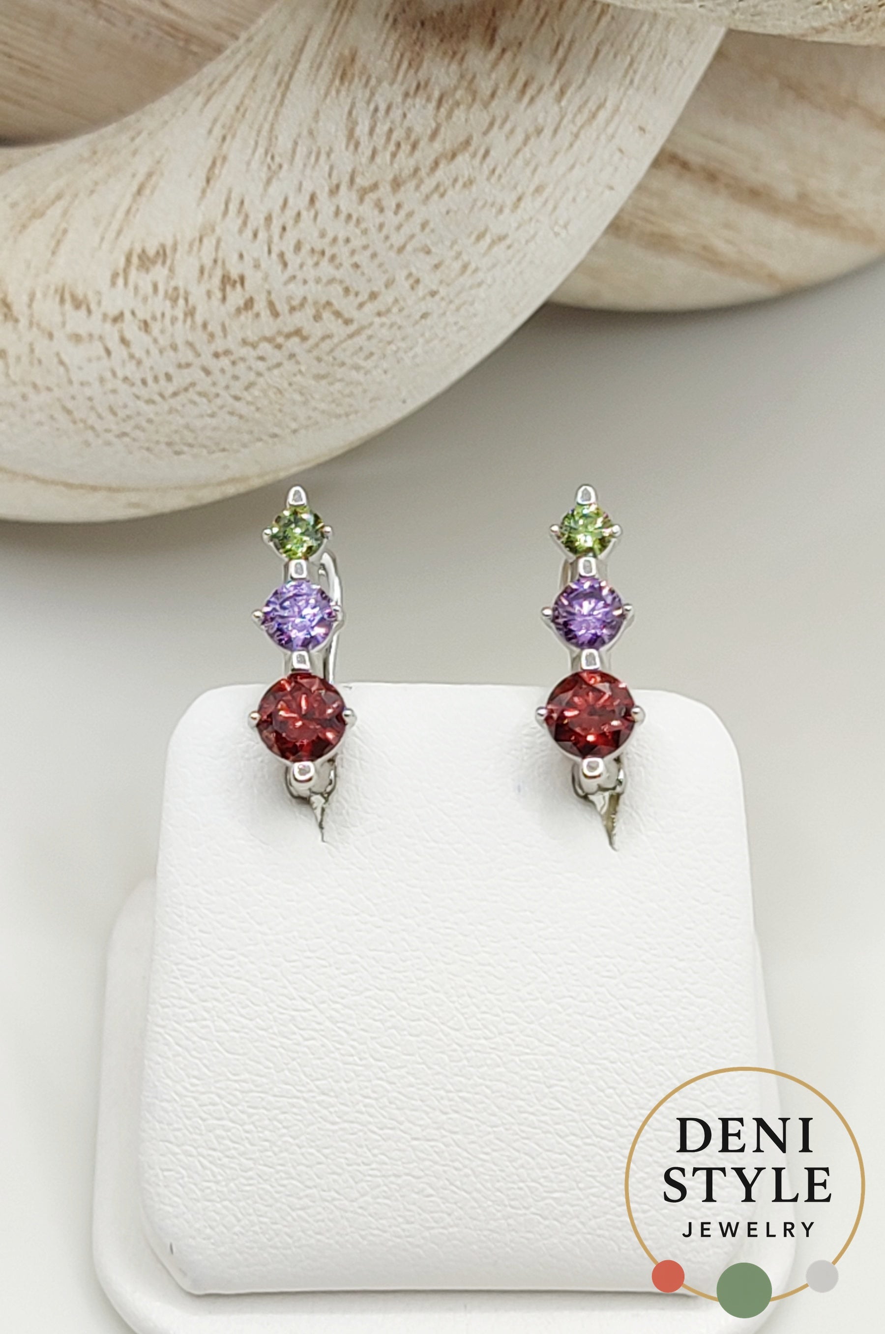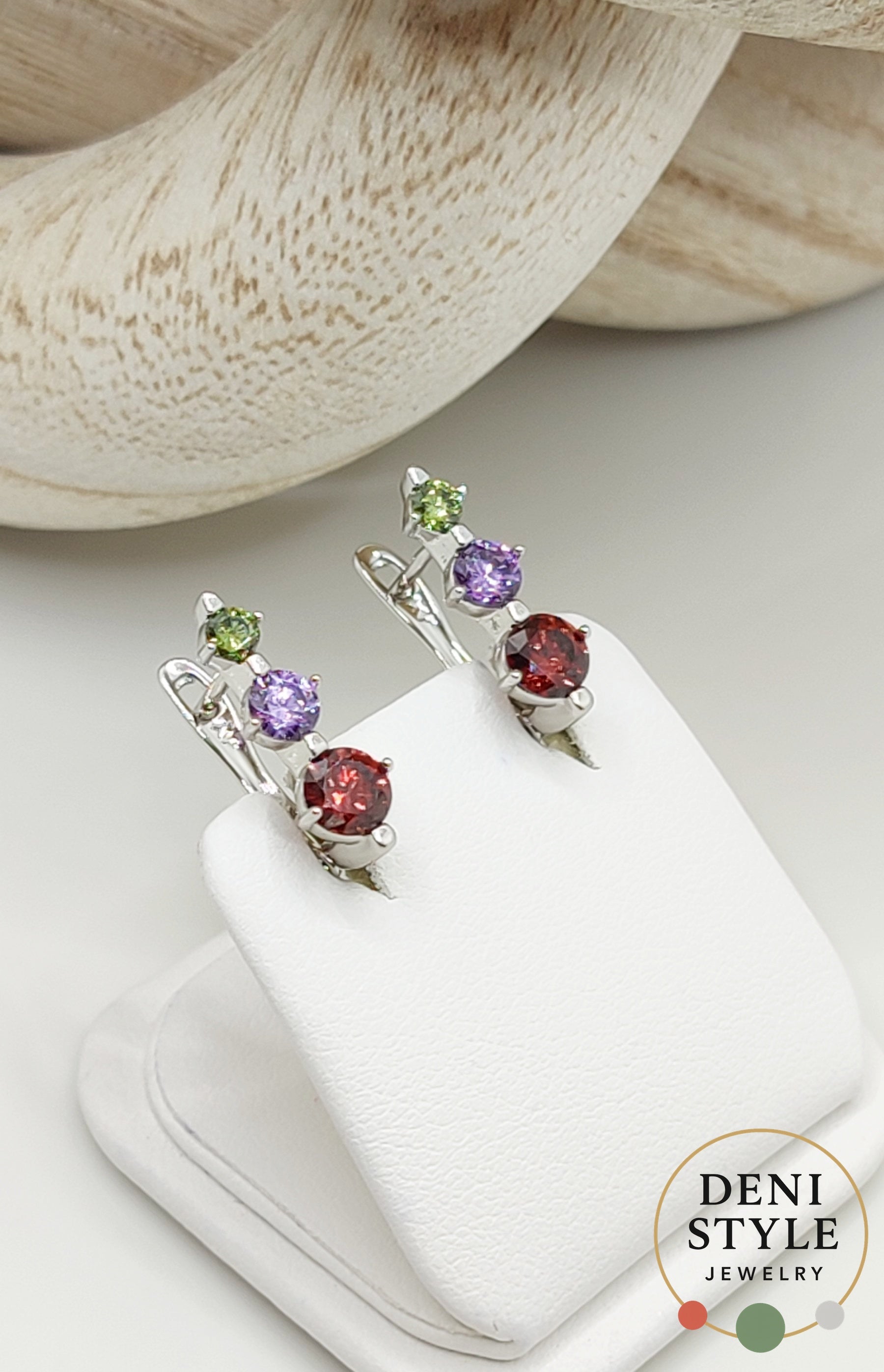 Ezüstös fényű, rhodium színű fülbevaló, amelyet három ragyogó kristály díszít: zöld, lila és mélybordó árnyalatban. Vidám, színes megjelenésével különleges hangulatot kölcsönöz, mégis elegáns kiegészítő marad. Antiallergén kialakításának köszönhetően kényelmes viselet a mindennapokban is.