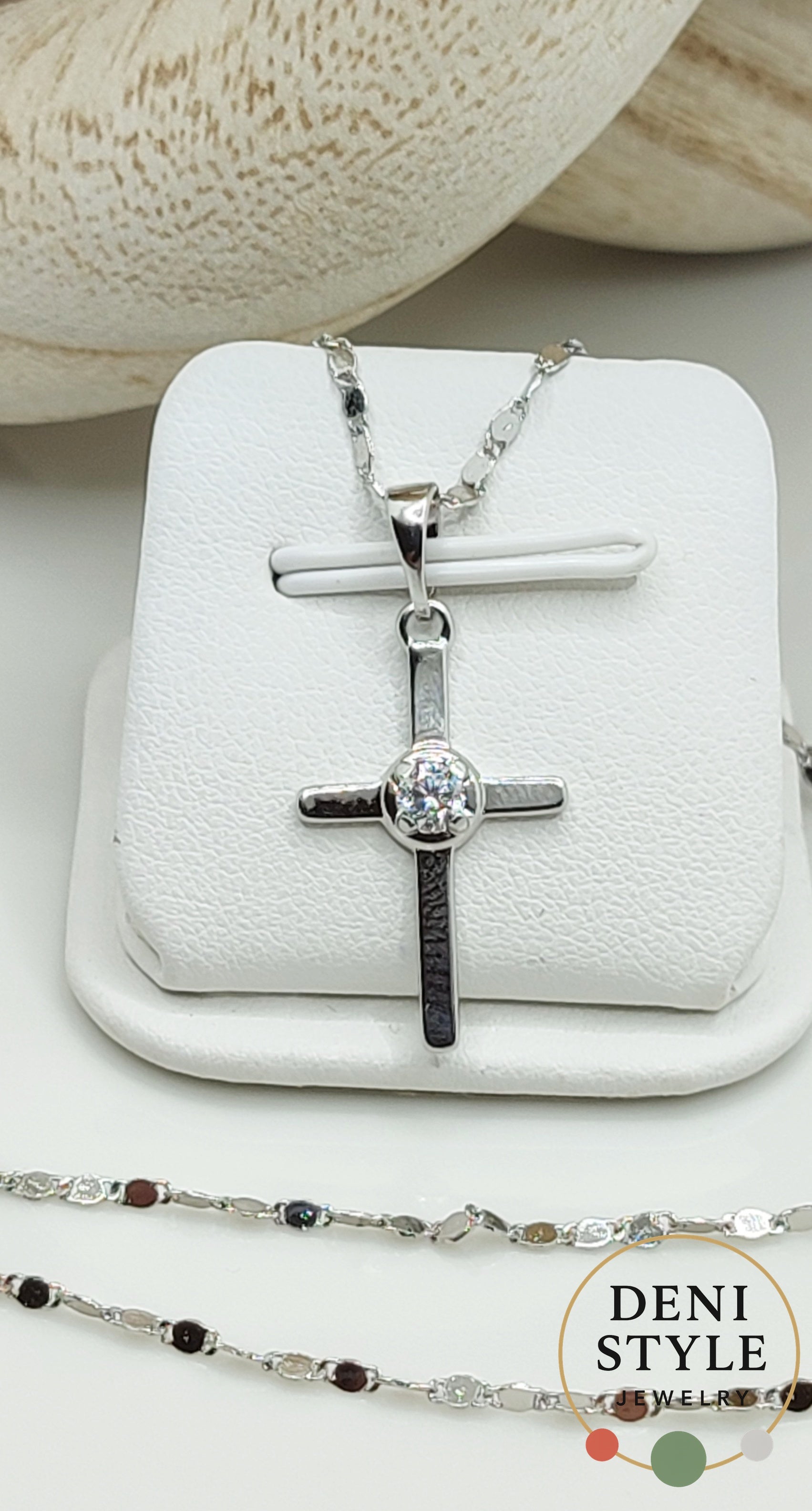 Ez a modern stílusú nyaklánc kereszt medállal díszített, amely közepén egy csillogó kővel emeli ki az eleganciát.