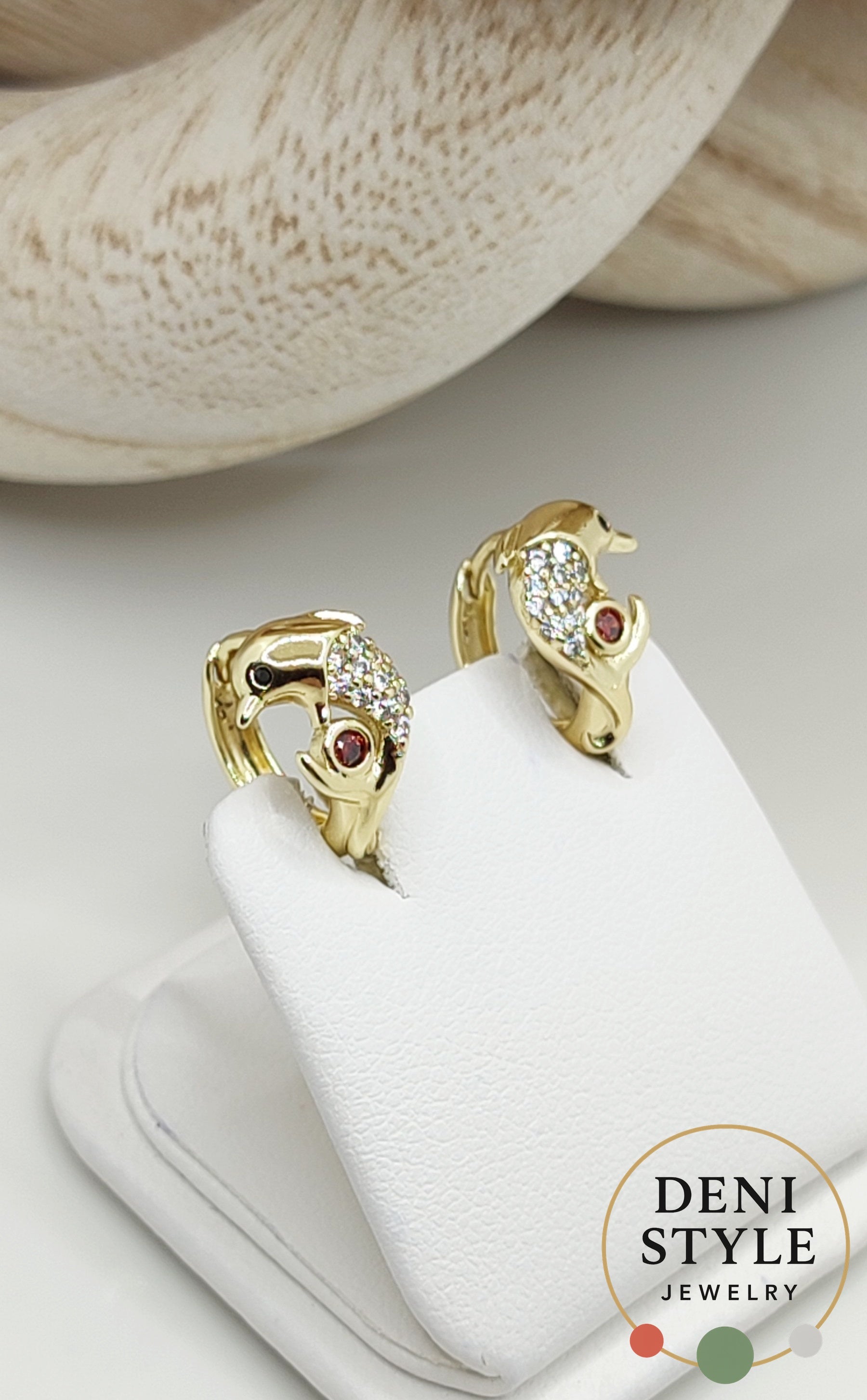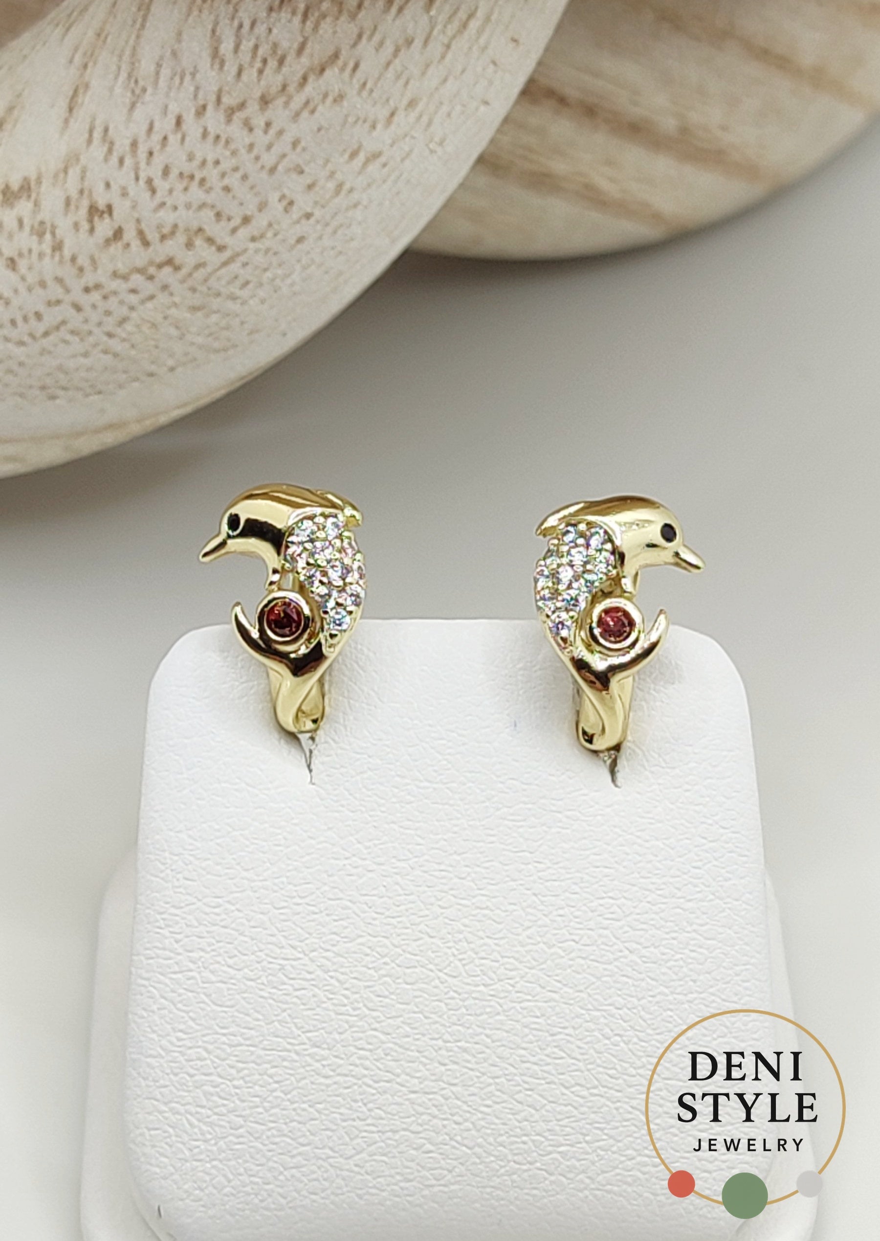 Aranyszínű gyermek fülbevaló kedves delfin formával, amelyet csillogó fehér kövek és egy apró piros kristály díszít. Vidám és játékos megjelenést ad, miközben biztonságos, antiallergén anyagból készült, így a kislányok számára kényelmes és bájos kiegészítő.