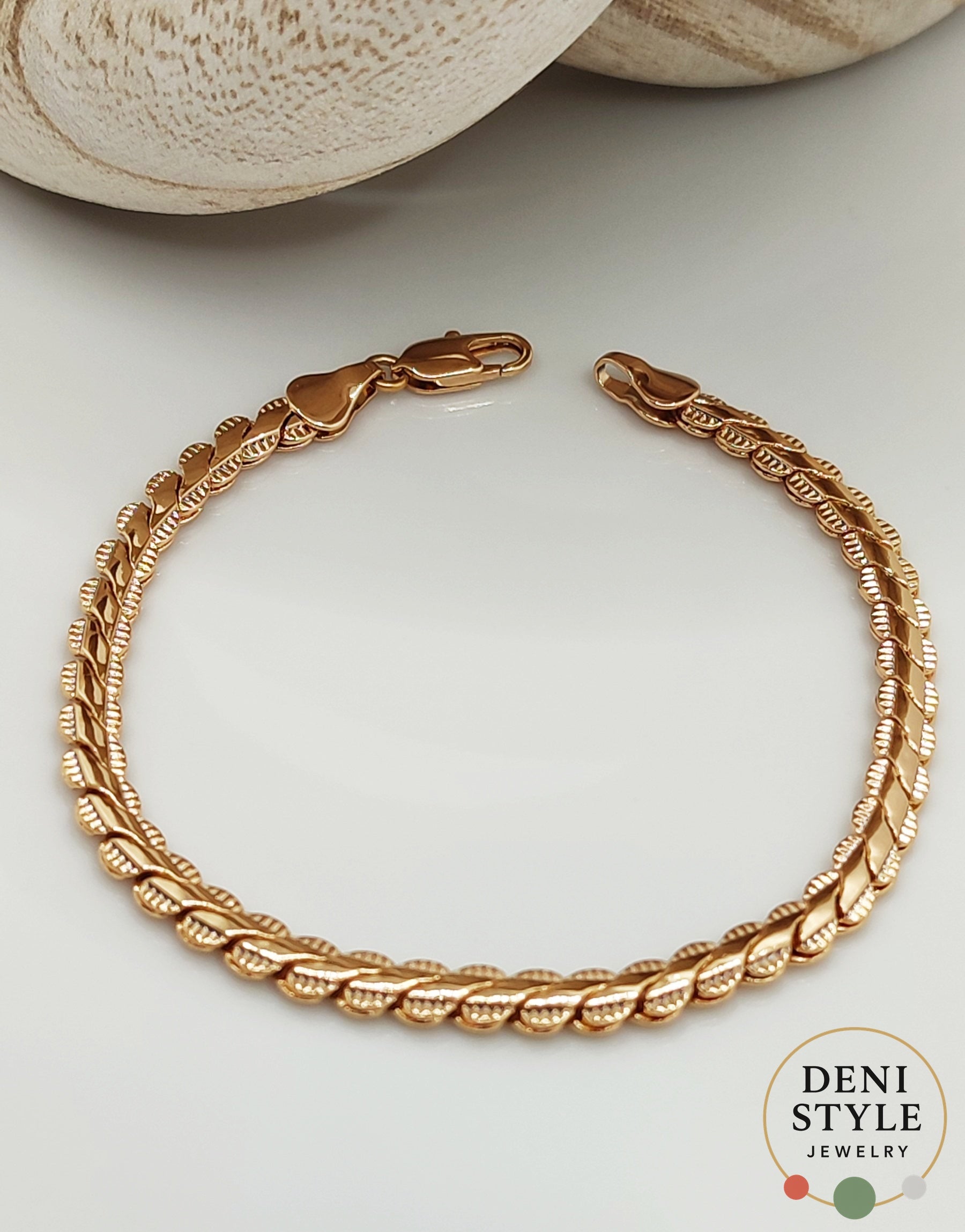 Finom, mégis különleges megjelenést nyújt ez a 18 k színű karkötő. Láncszemeinek elegáns fonott mintázata letisztult stílust képvisel, amely hétköznapi és alkalmi viselethez egyaránt tökéletes. Antiallergén kialakításának köszönhetően érzékeny bőrűek is bátran viselhetik.