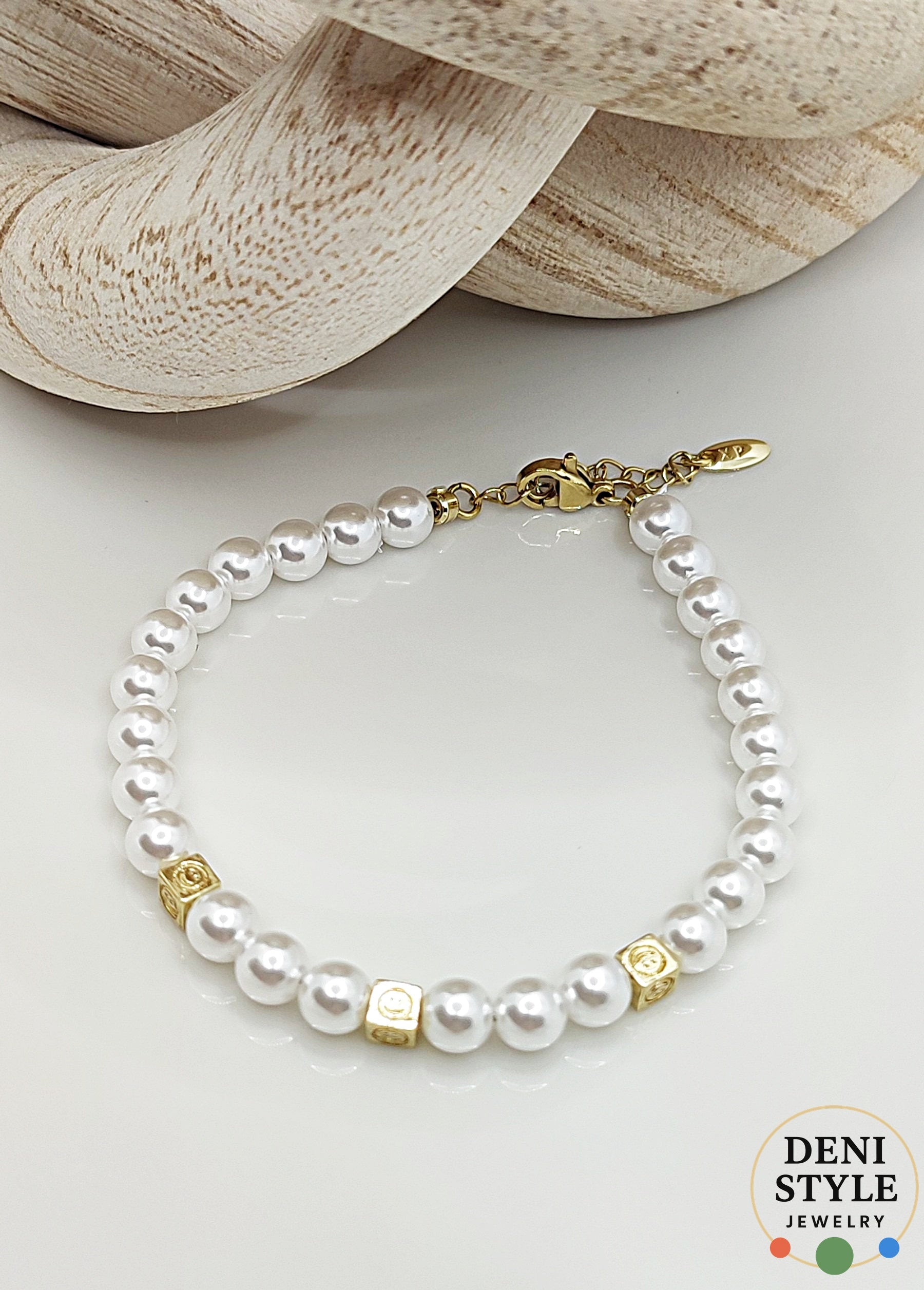Kifinomult gyöngy karkötő, amelyet apró arany díszek tesznek egyedivé. Klasszikus eleganciát sugároz, így tökéletes kiegészítő ünnepi alkalmakra, ugyanakkor visszafogott szépsége miatt a hétköznapokban is stílusos választás.
