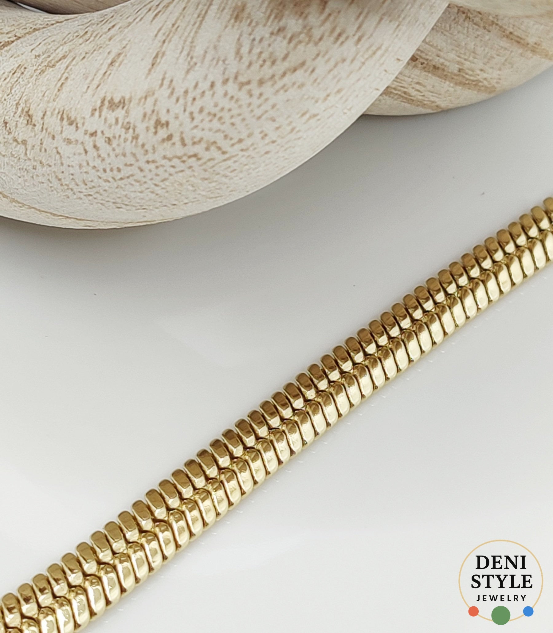 Arany színű karkötő, melyet elegáns, sűrűn egymásba simuló szemek alkotnak. Masszív, mégis kifinomult megjelenésű darab, amely stílusosan emeli ki bármely öltözéket. Klasszikus és időtálló kiegészítő, amelyet fémérzékenyek is bátran viselhetnek, így tökéletes választás mindennapi viselethez és különleges alkalmakhoz is.