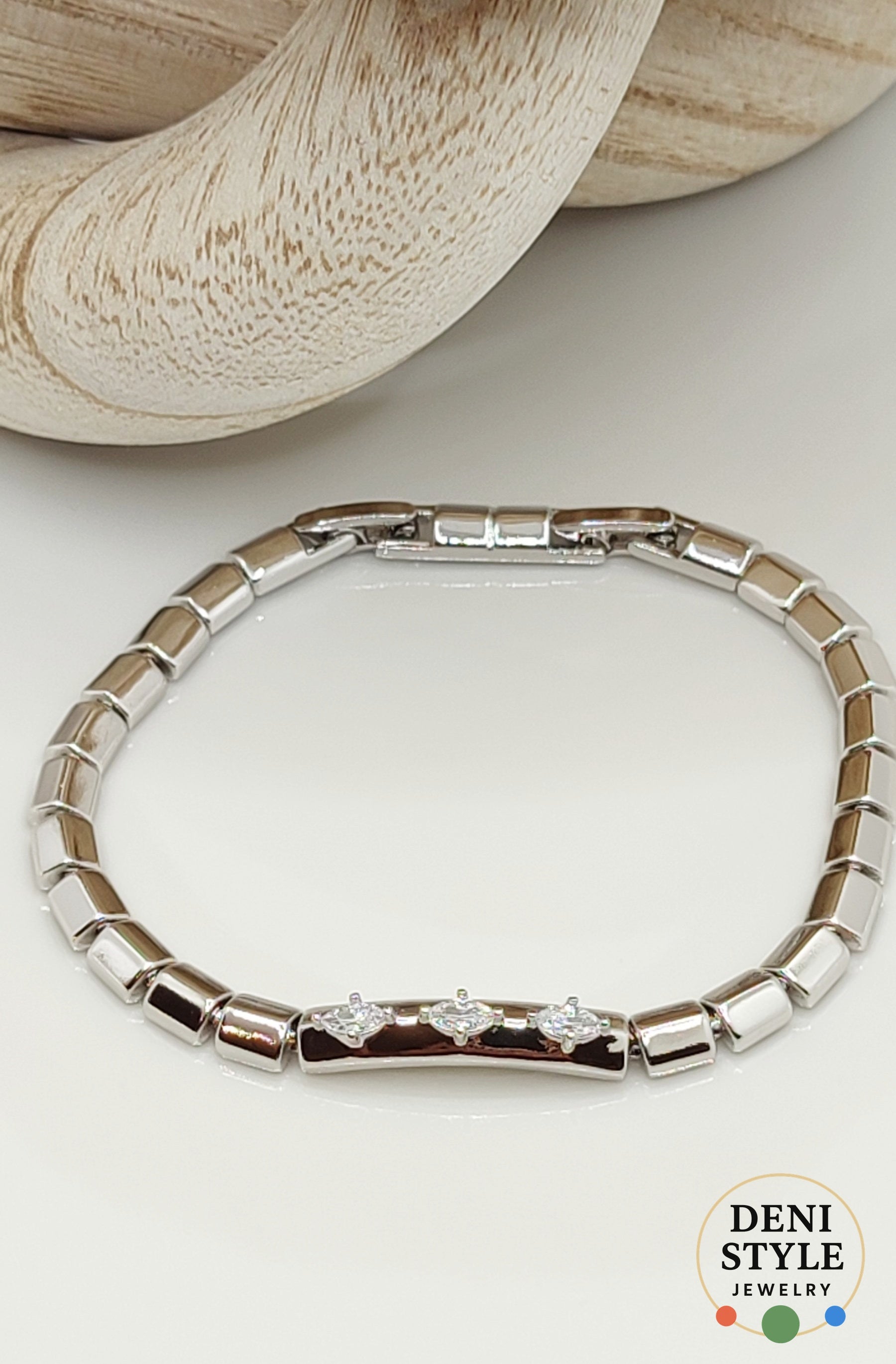 Kifinomult ezüstszínű karkötő, amelyet modern, szögletes elemek alkotnak. Elülső részén három apró, ragyogó kő díszíti, amelyek elegáns csillogást kölcsönöznek a darabnak .Antiallergén kialakításának köszönhetően fémérzékenyek is biztonsággal viselhetik, Tökéletes választás azoknak, akik szeretik az időtlen, letisztult stílust.