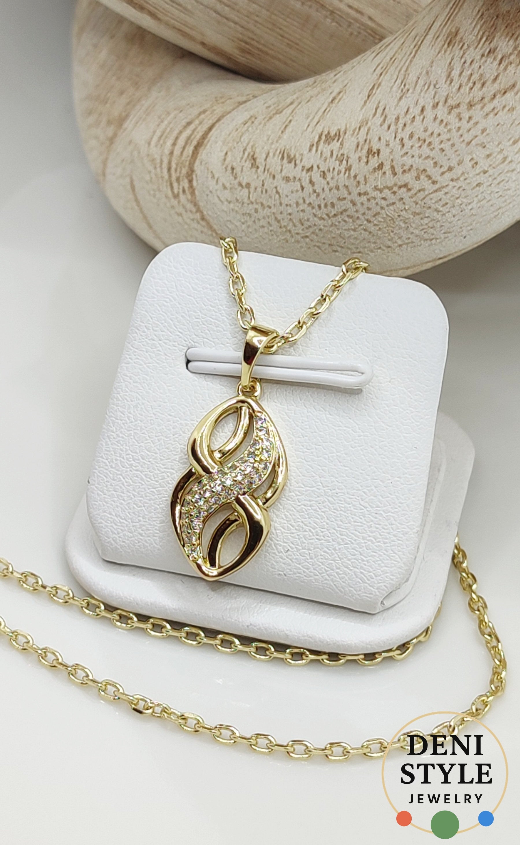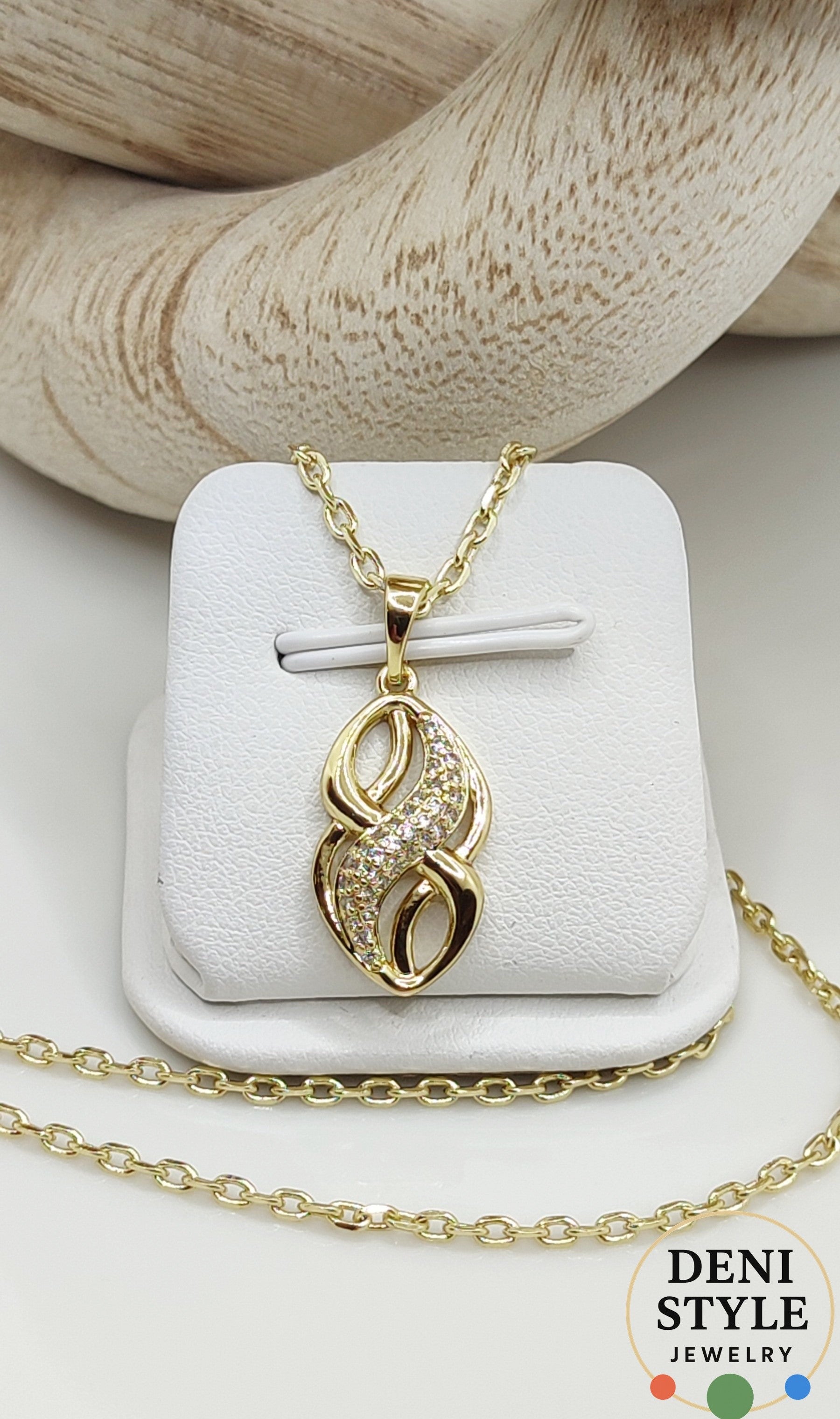 Ez az elegáns nyaklánc különleges, ívelt formájú medállal díszített, amelyet apró, csillogó kristályok tesznek ragyogóvá.