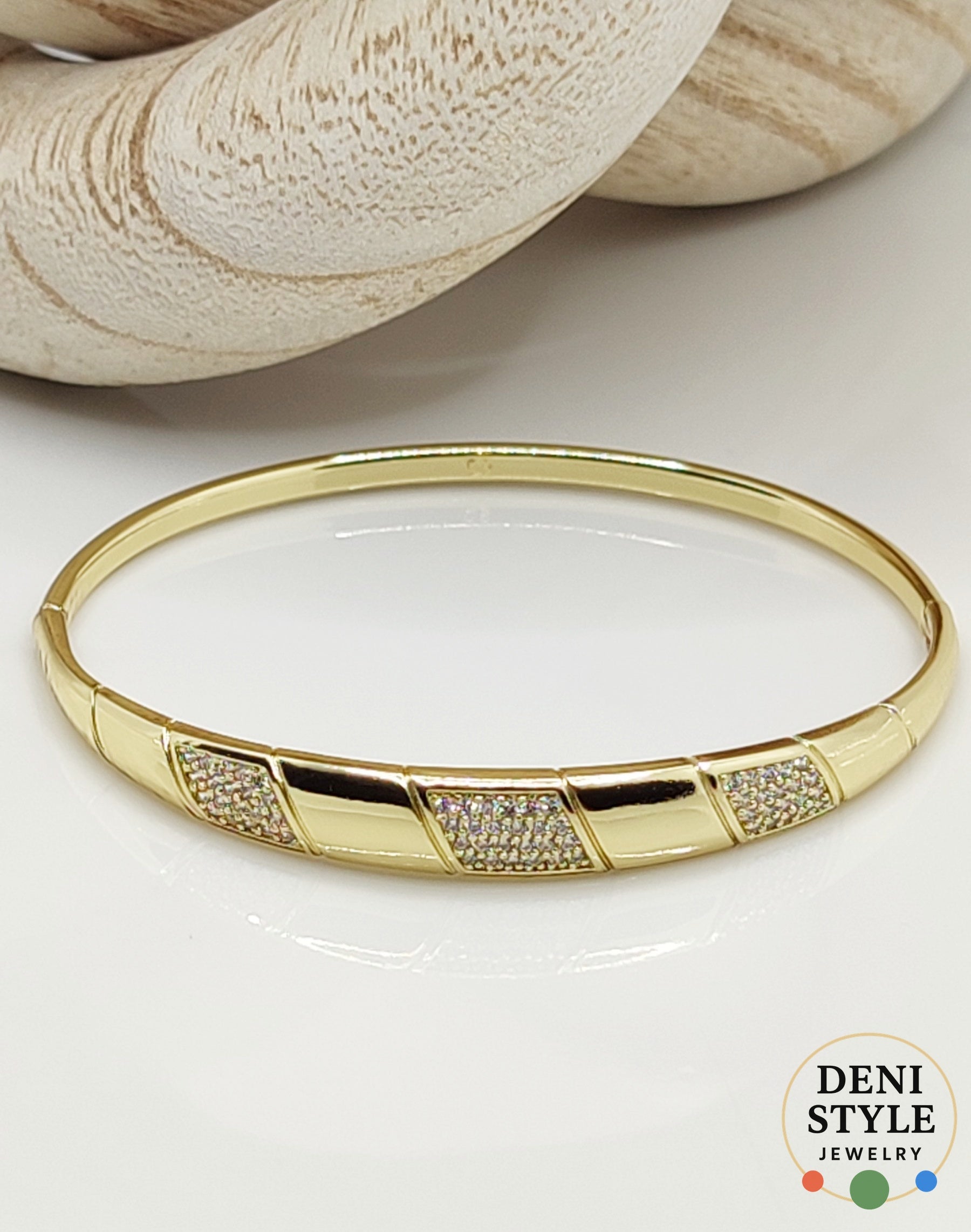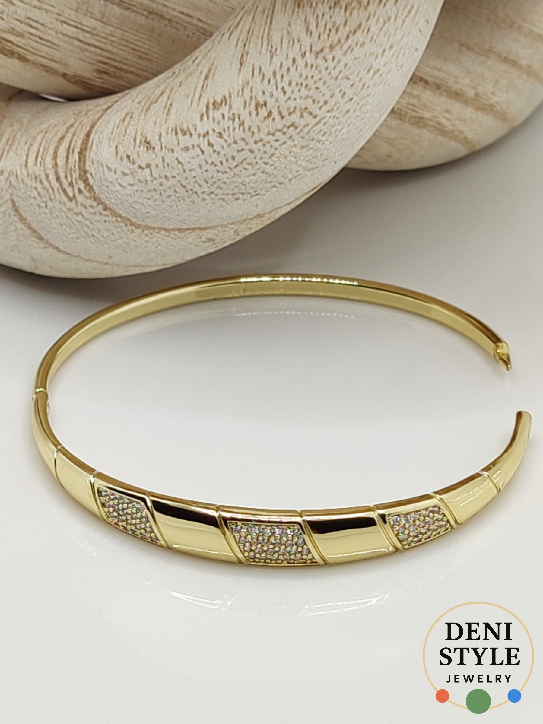Elegáns arany színű karperec, melyet finom, kristályos díszítés tesz különlegessé. Letisztult formája miatt tökéletes választás a mindennapokra, de alkalmi öltözékhez is csodásan illik. Kifinomult darab, amely időtálló eleganciát sugároz.
