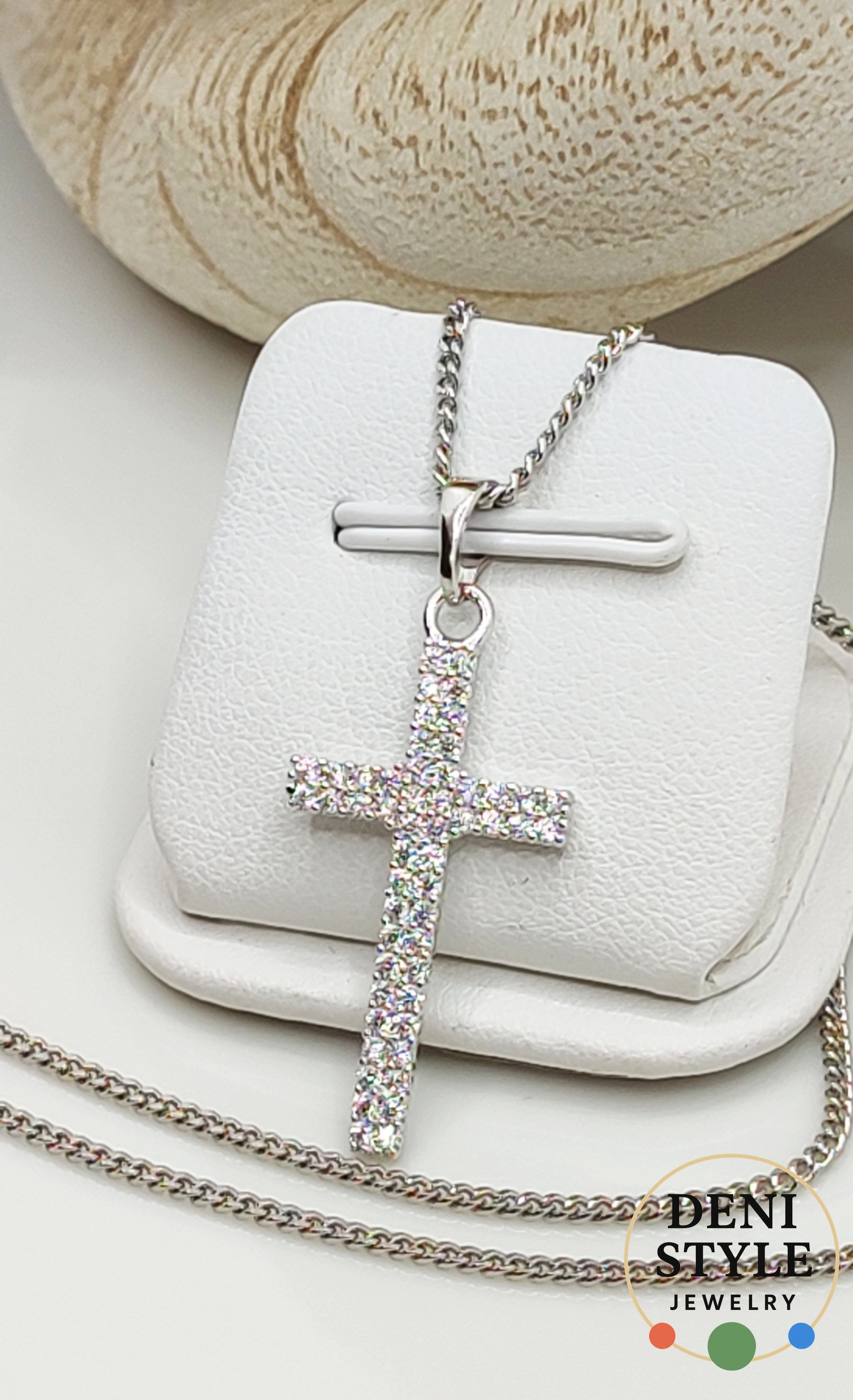 Letisztult, mégis ragyogó kereszt medálos nyaklánc, apró cirkónia kövekkel díszítve.
