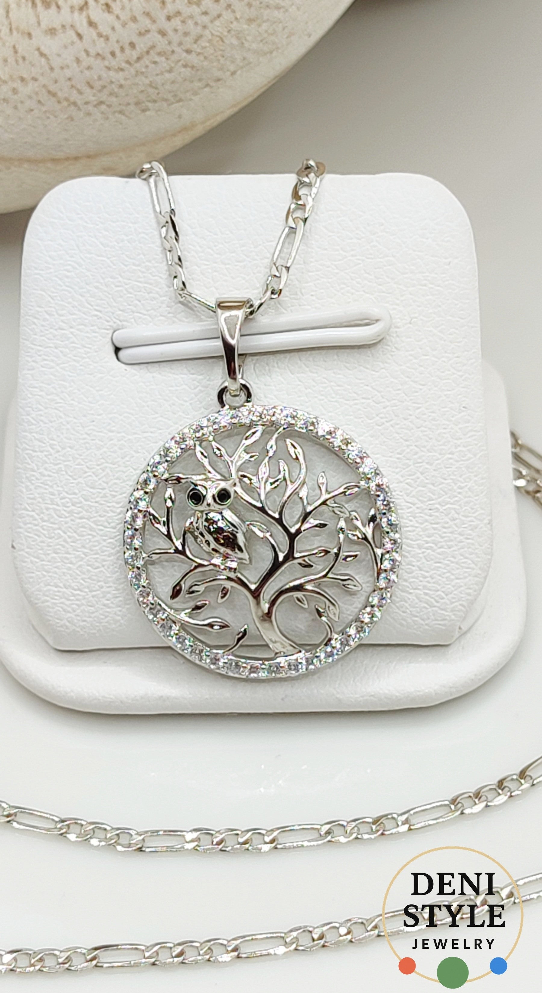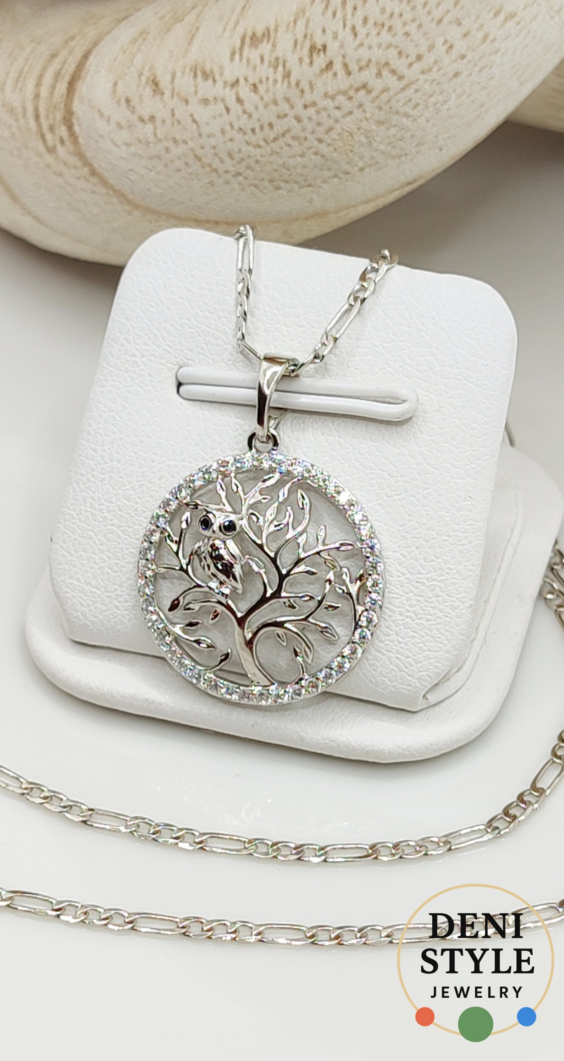 Ragyogó, ezüst színű nyaklánc, melyen az életfa és egy apró bagoly motívum található.