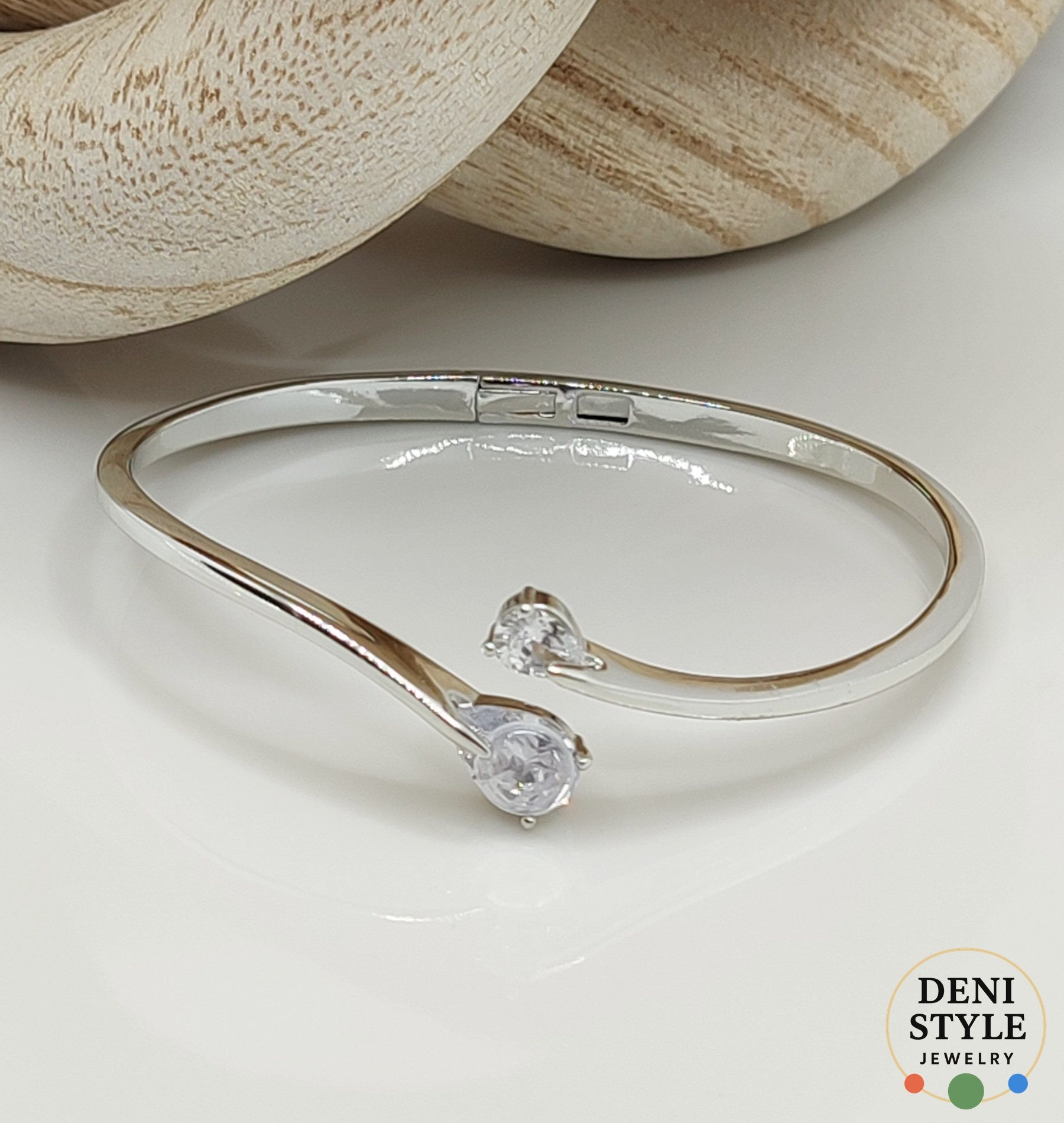 A karkötő a letisztultság és az elegancia találkozása. Két csillogó kő díszíti, amelyek lágyan ölelik körbe a csuklót. Antiallergén anyagból készült, így fémérzékenyek számára is biztonságosan viselhető. Tökéletes választás ünnepi alkalmakra, vagy mindennapi ragyogás kiegészítőjeként.
