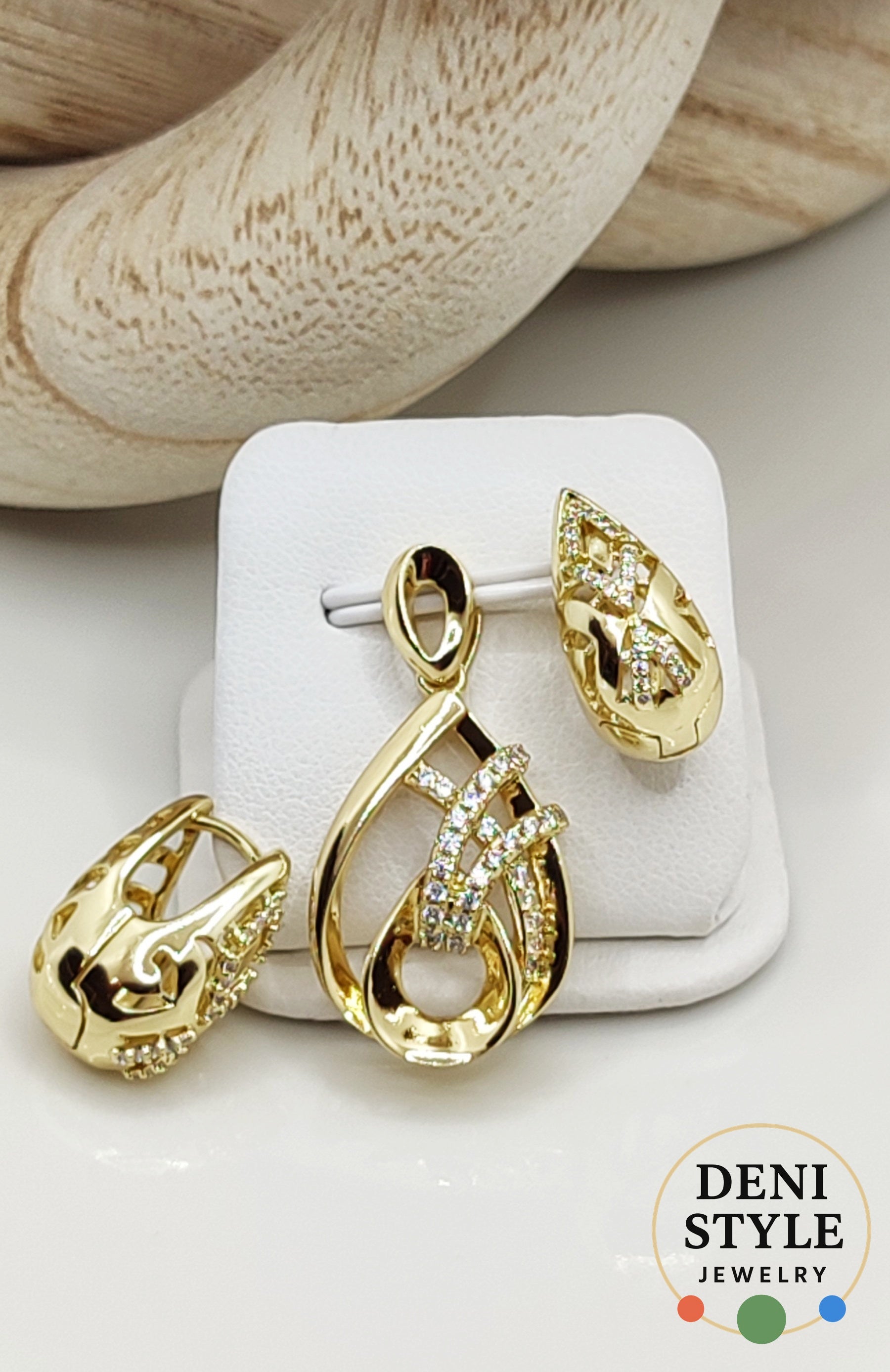 Elegáns, arany színű ékszerszett, mely könnycsepp formájú medálból és hozzá illő fülbevalókból áll. Csillogó kövekkel díszített, modern és mégis időtlen darab, amely minden alkalomhoz méltó kiegészítő. Antiallergén, így fémérzékenyek is bátran viselhetik.
