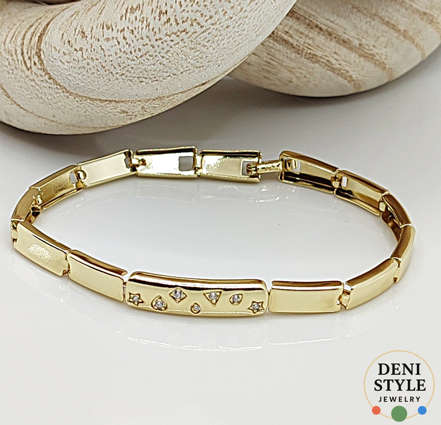 Elegáns, arany színű karkötő apró, csillogó cirkónia kövekkel díszítve.