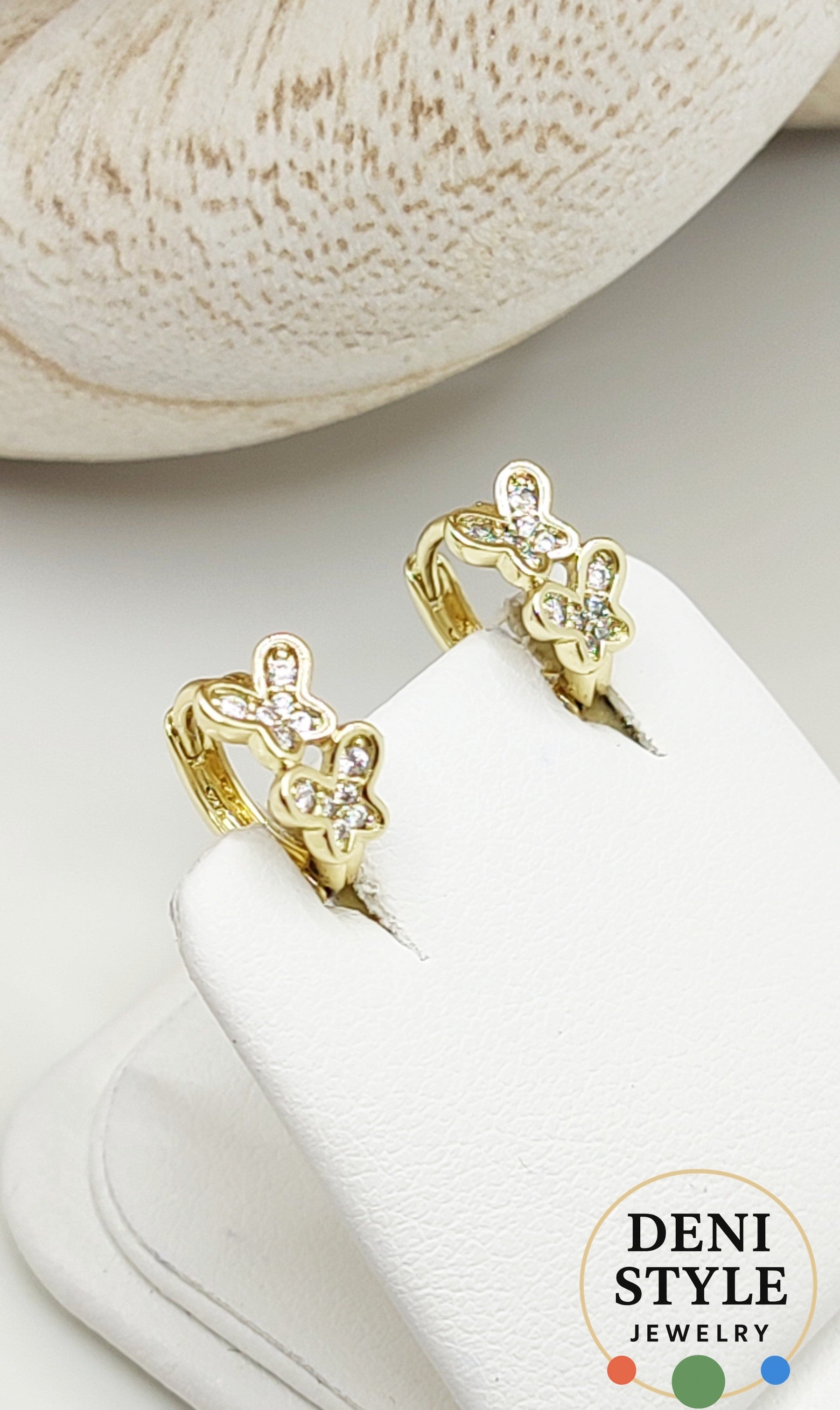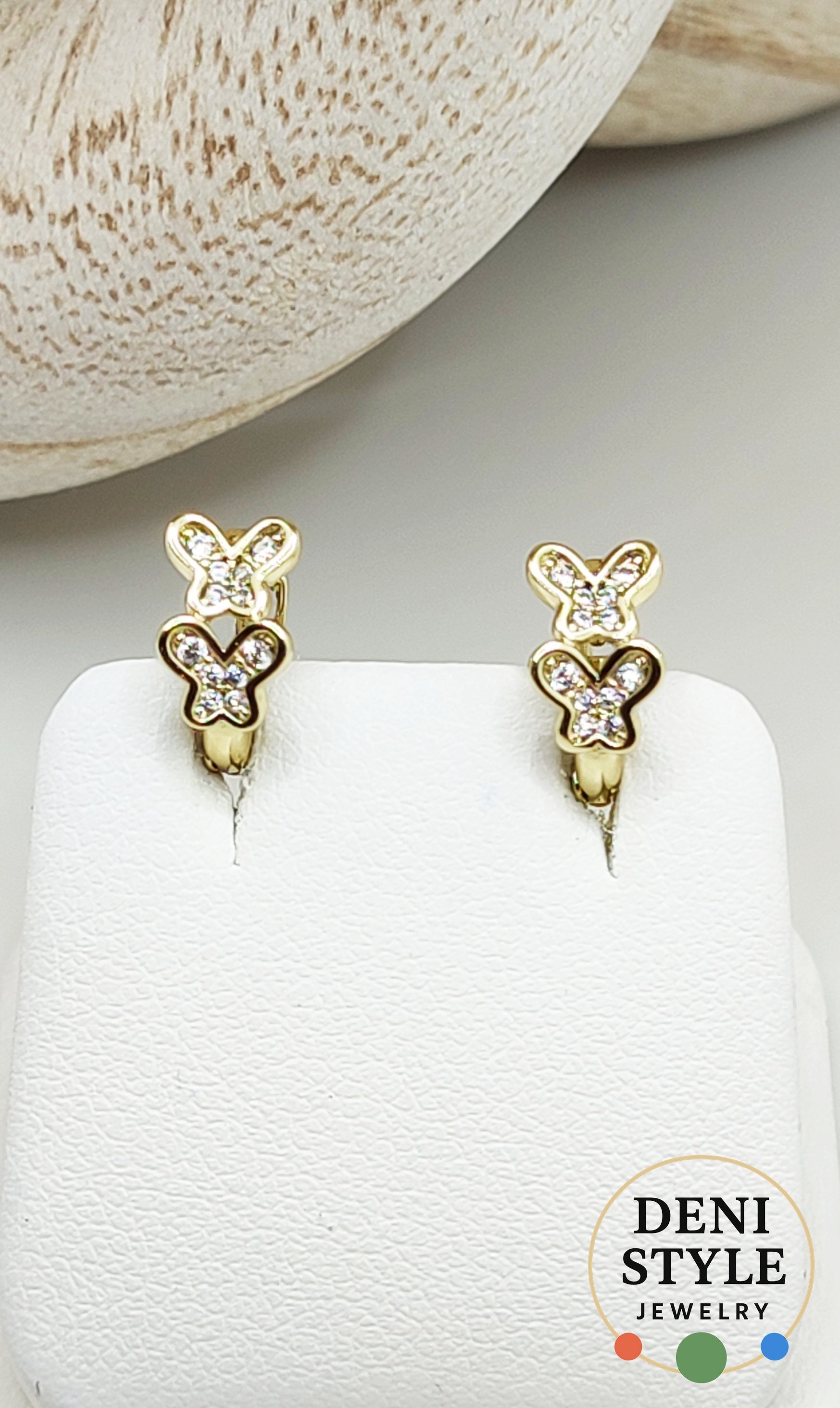 Finom, arany színű pillangó formájú fülbevaló, apró cirkónia kövekkel díszítve.