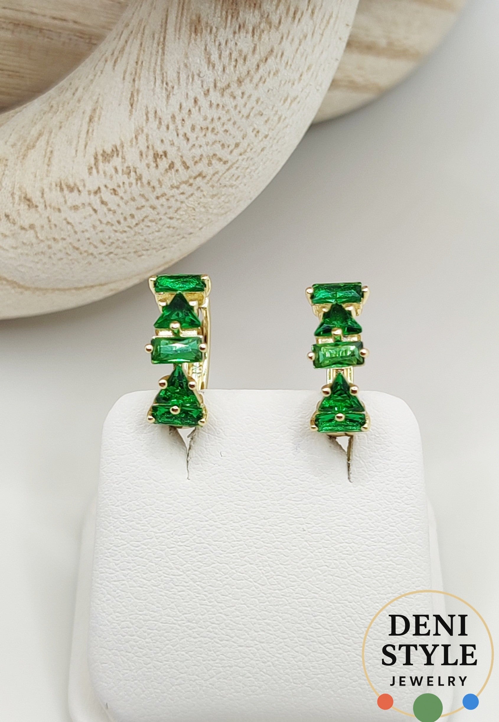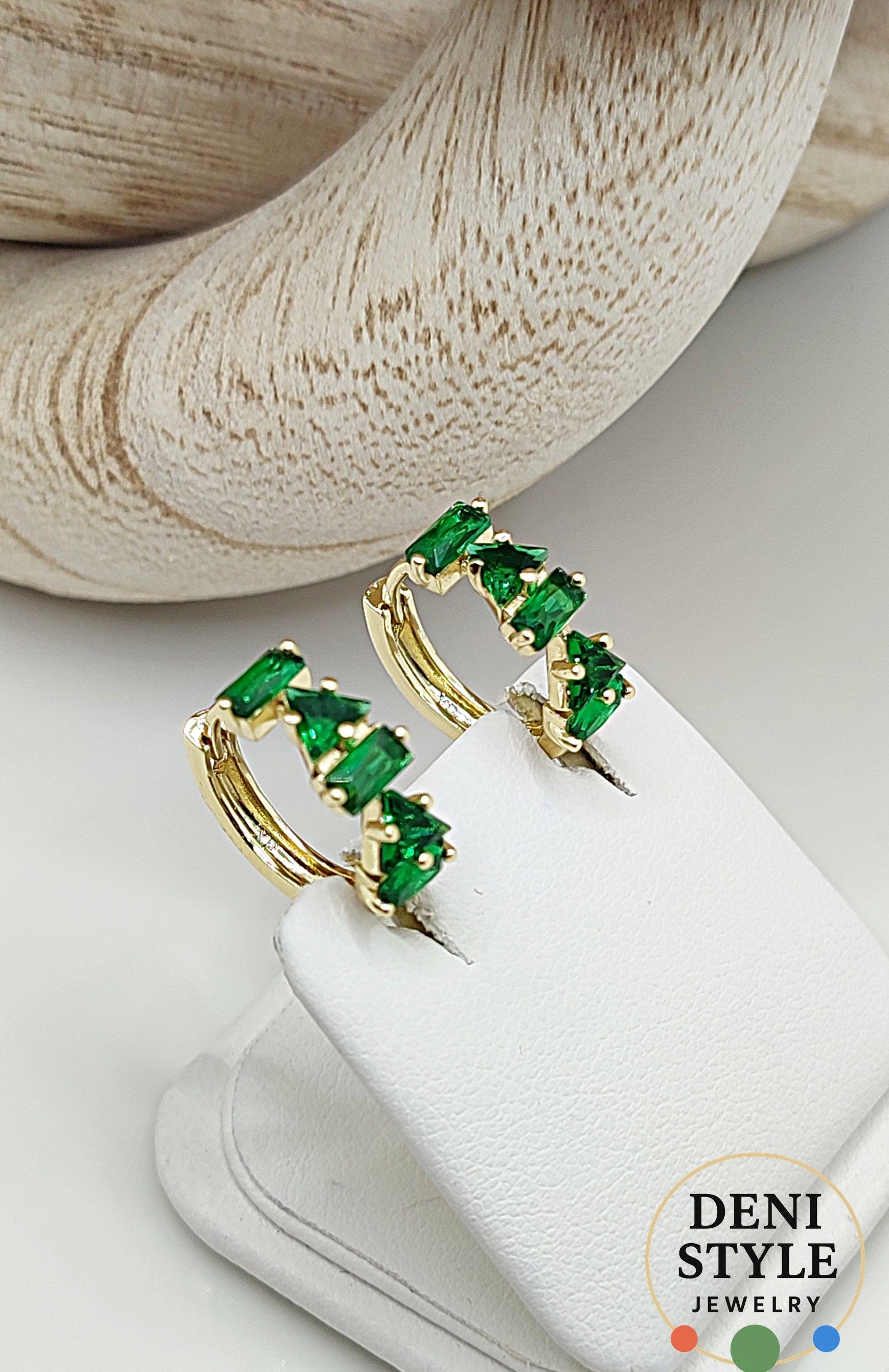 Káprázatos zöld kristályok díszítik ezt a finoman ívelt, 14K arany színű fülbevalót.